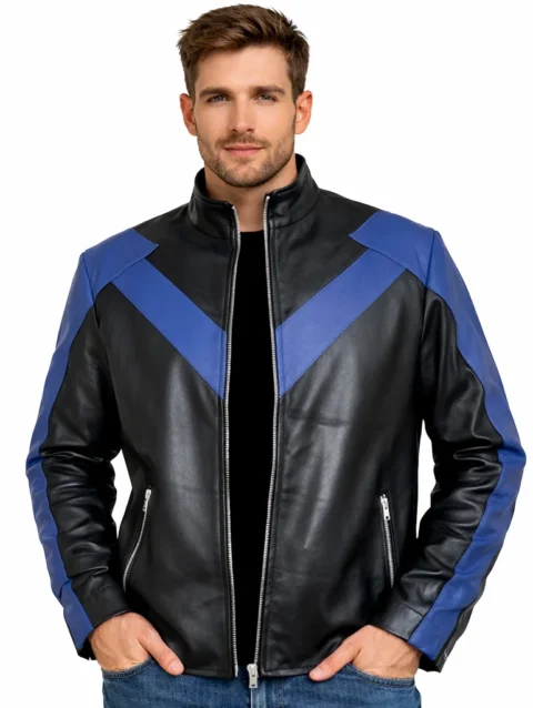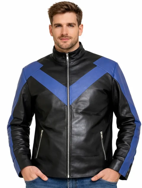 Nightwing Adult Men’s Faux Leather Jacket Cosplay & Streetwear, Black with Emblem