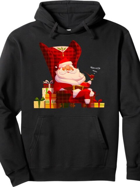 Black Pullover Hoodie with Santa Claus Graphic – Christmas Plaid Chair & Gifts Design