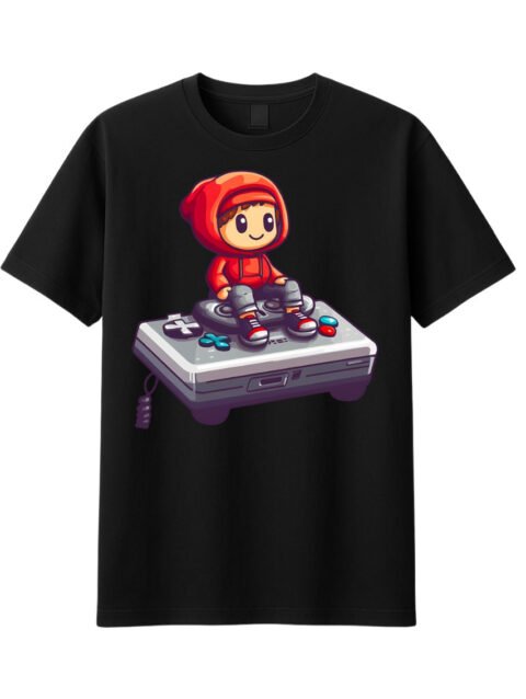 Black Gamer Cartoon Graphic T-Shirt Character Sitting on Video Game Controller Tee