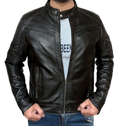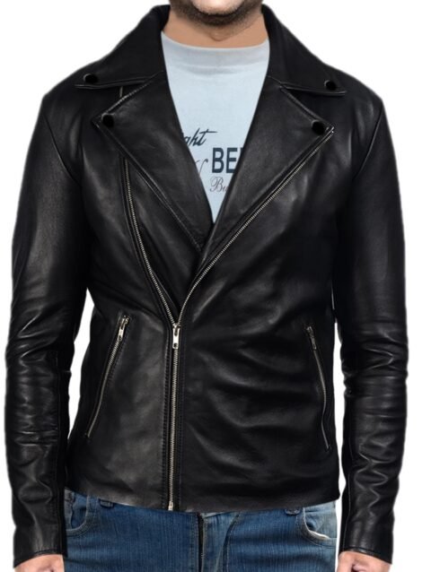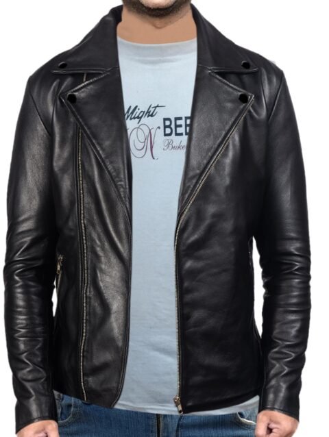 Men’s Black Sheepskin Leather Biker Jacket Notch Collar with Zipper Closure