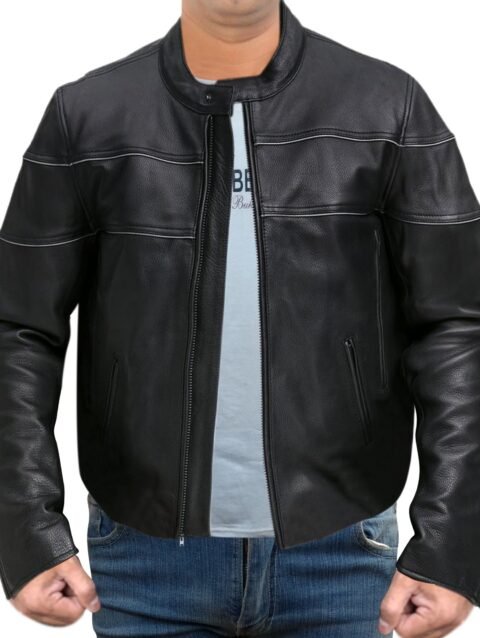 Men’s Black Leather Motorcycle Jacket with Reflective Piping Real Leather Biker Jacket