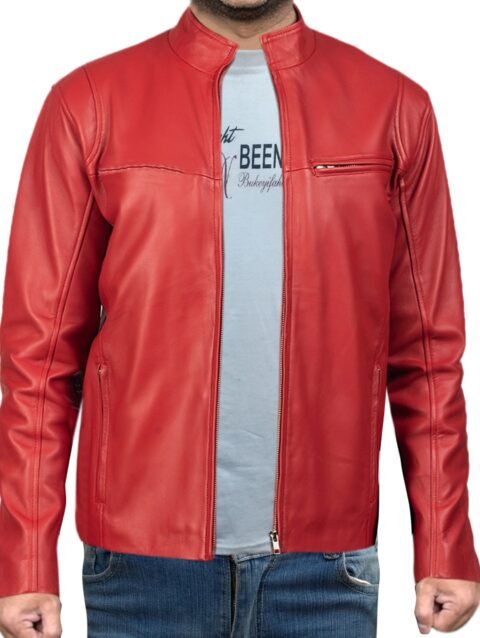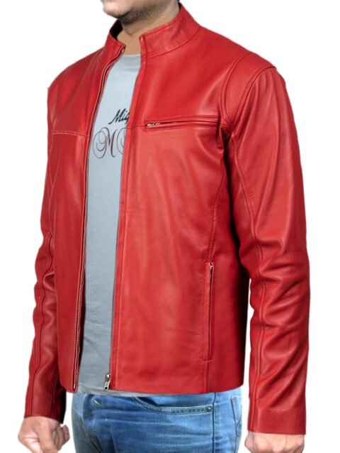 Men’s Red Lambskin Leather Fashion Jacket with Snap-Tab Collar & Front Zip Closure