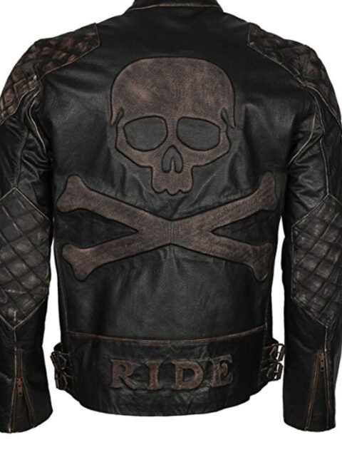 Men’s Skull Embossed Distressed Black Leather Motorcycle Jacket Gothic Biker Style