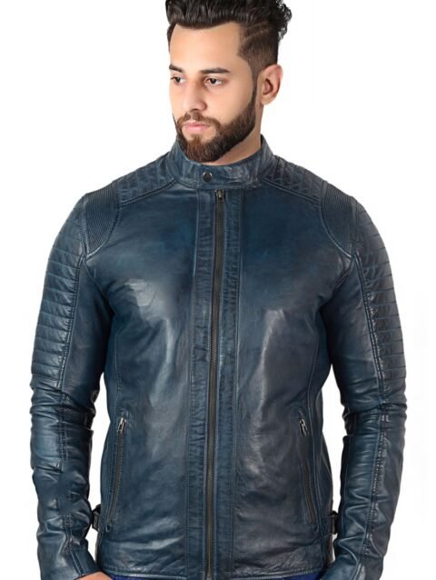 Men’s Navy Blue Genuine Leather Jacket with Band Collar & Quilted Shoulder and Sleeve Detailing