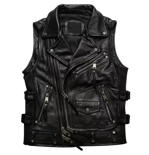 Men’s Black Genuine Leather Biker Vest with Zip & Snap Closures and Adjustable Sides