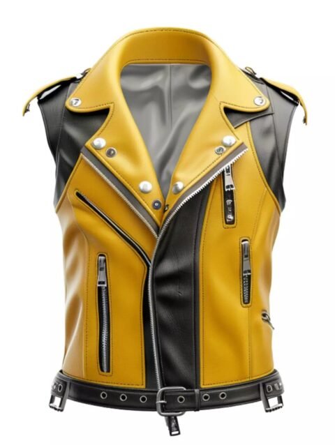 Men’s Yellow and Black Leather Biker Vest Stylish Motorcycle Leather Outerwear