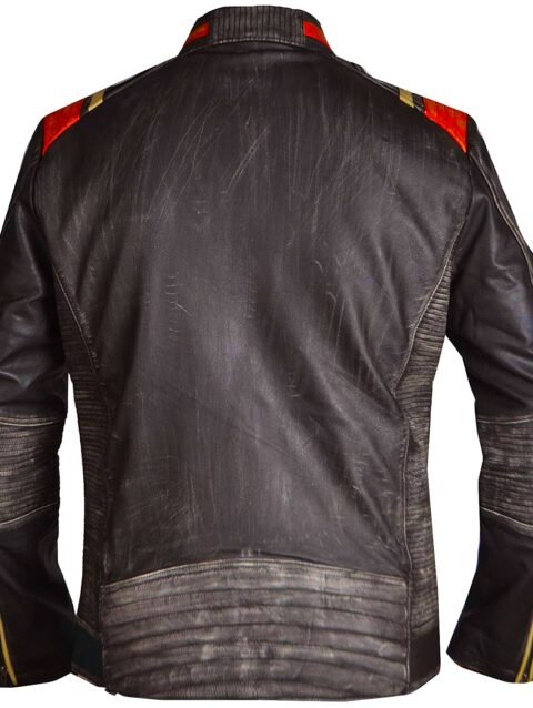 Men’s Vintage Distressed Black Leather Motorcycle Café Racer Jacket with Red & White Stripes
