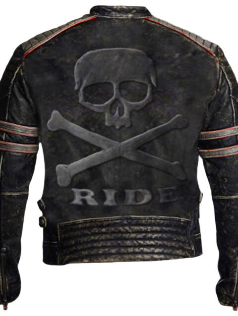 Men’s Vintage Distressed Black Leather Cafe Racer Motorcycle Jacket Red Racing Stripes
