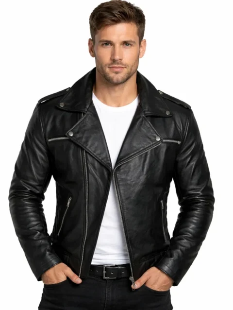 Men’s Black Genuine Sheepskin Leather Biker Jacket Negan Inspired from The Walking Dead