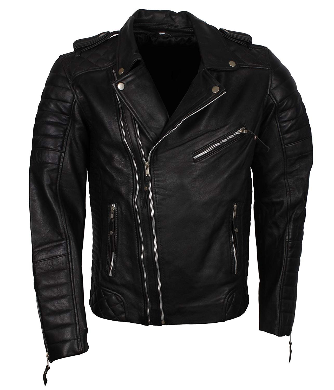 Black Asymmetrical Leather Biker Jacket with Quilted Panels and Double Zipper Closure