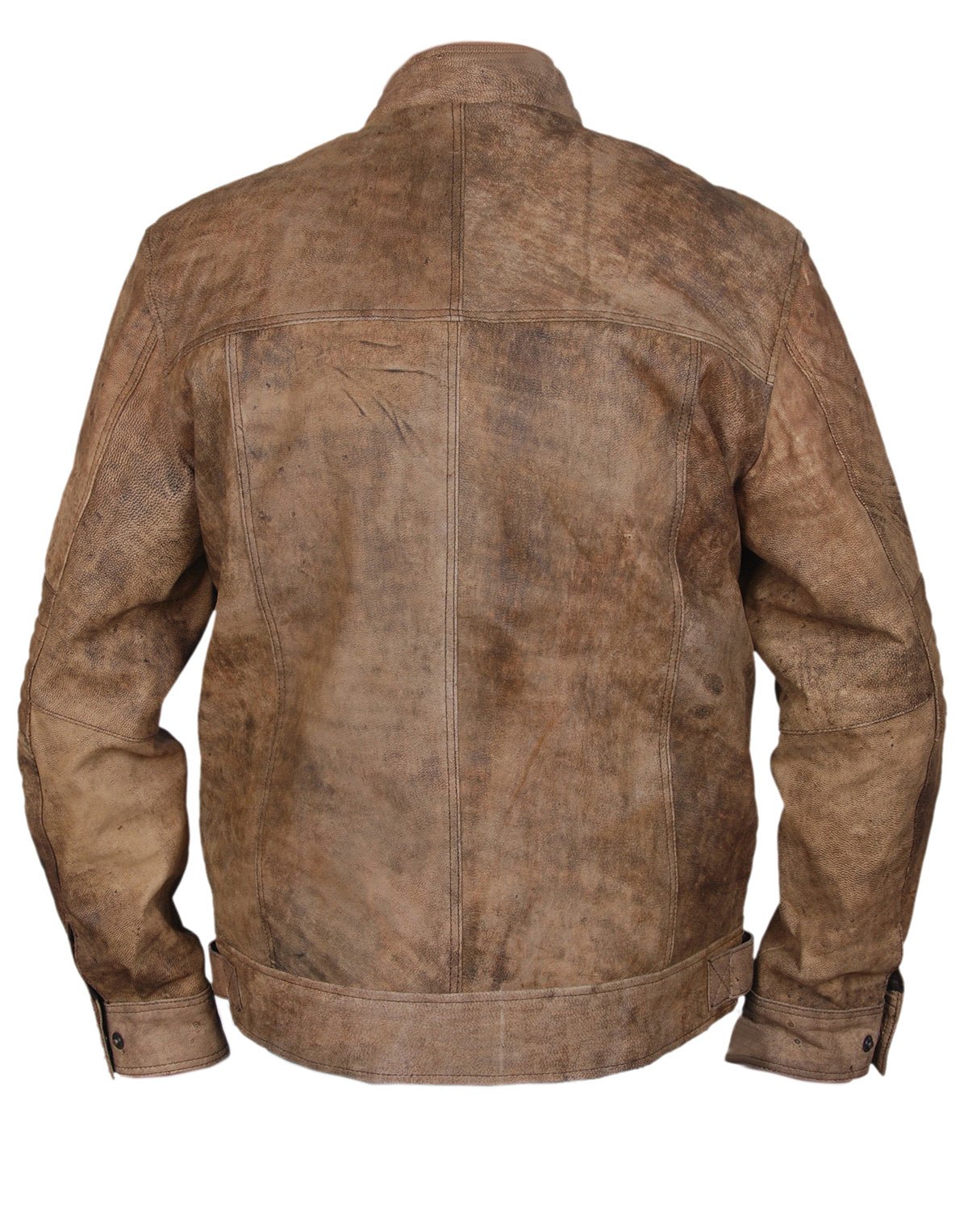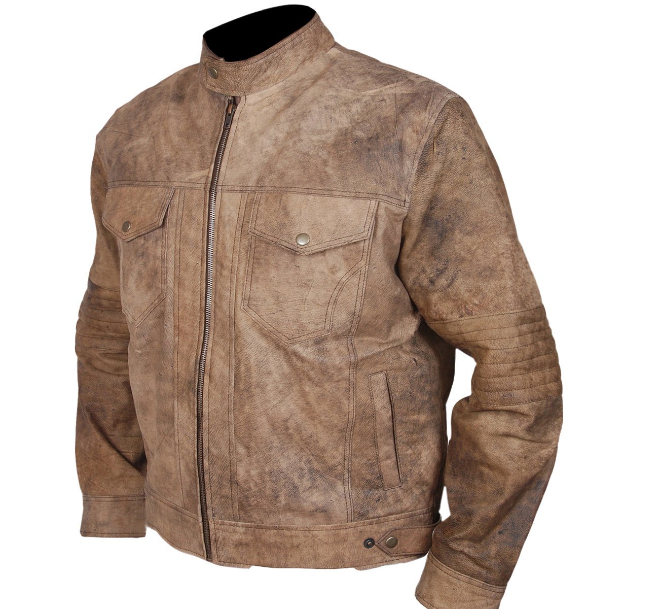 Distressed Brown Leather Café Racer Jacket with Snap Collar & Dual Chest Pockets