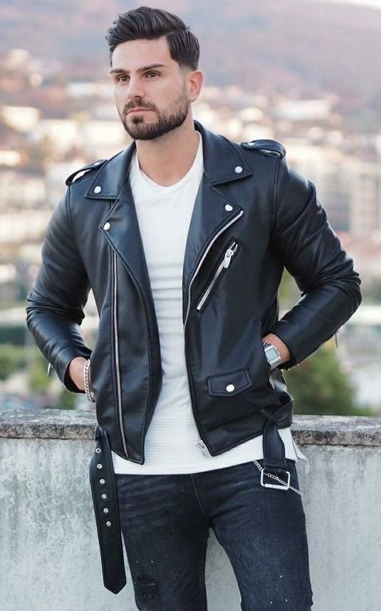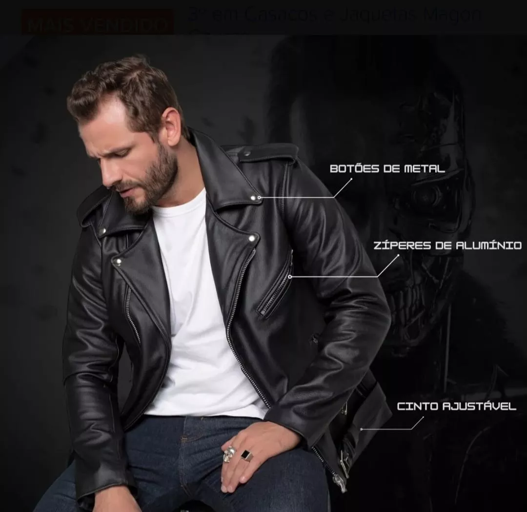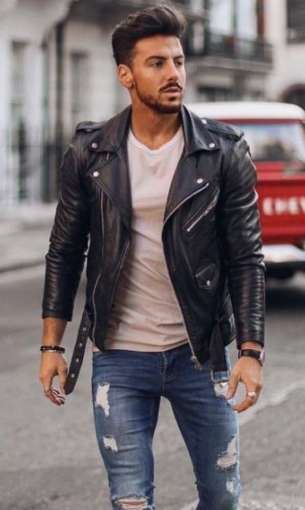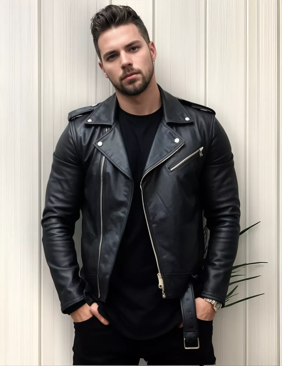 - Collar: Notched lapel collar with snap buttons, embodying the quintessential biker jacket look.