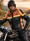 Harley-Davidson Men’s Victory Lane Black Leather Motorcycle Jacket with Orange & Cream Racing Stripes