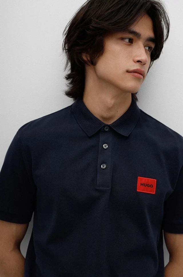 - Featuring tipping at the cuffs and collar, this polo shirt is cut to a defined fit and trimmed with a HUGO logo patch in signature red