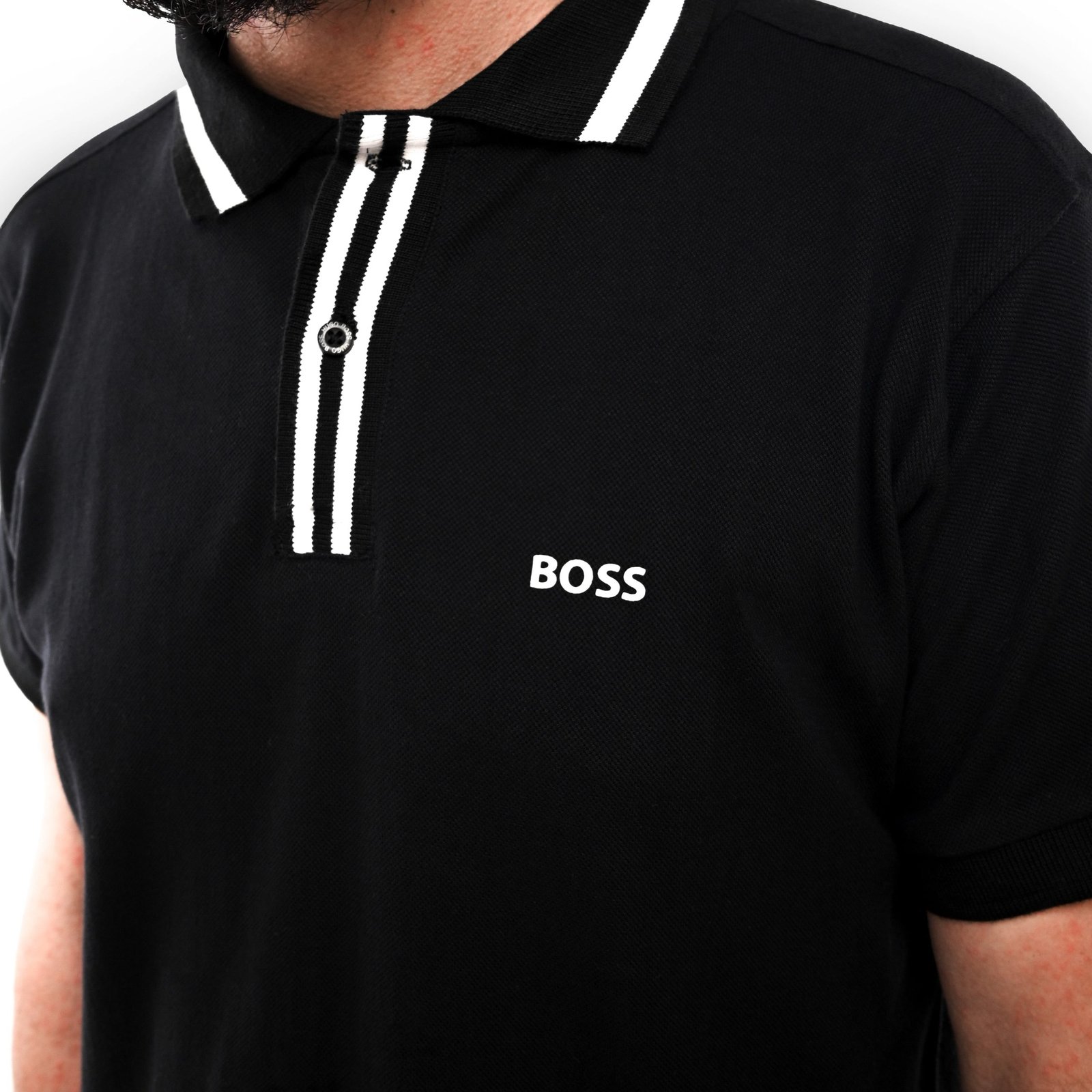 This Hugo Boss polo shirt is black with a white stripe on the collar. It’s made from high-quality materials and has a comfortable and stylish fit. The shirt is perfect for casual or formal occasions and is a great addition to any wardrobe.