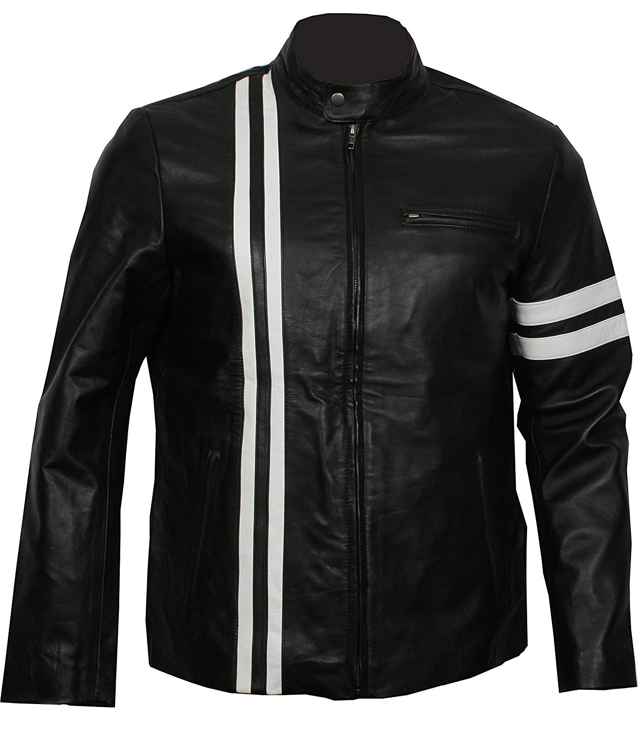 The classic black leather with contrasting white racing stripes delivers a timeless aesthetic that appeals to both motorsport enthusiasts and fashion-forward individuals. Make a statement with a jacket that merges film-inspired style and biker authenticity.