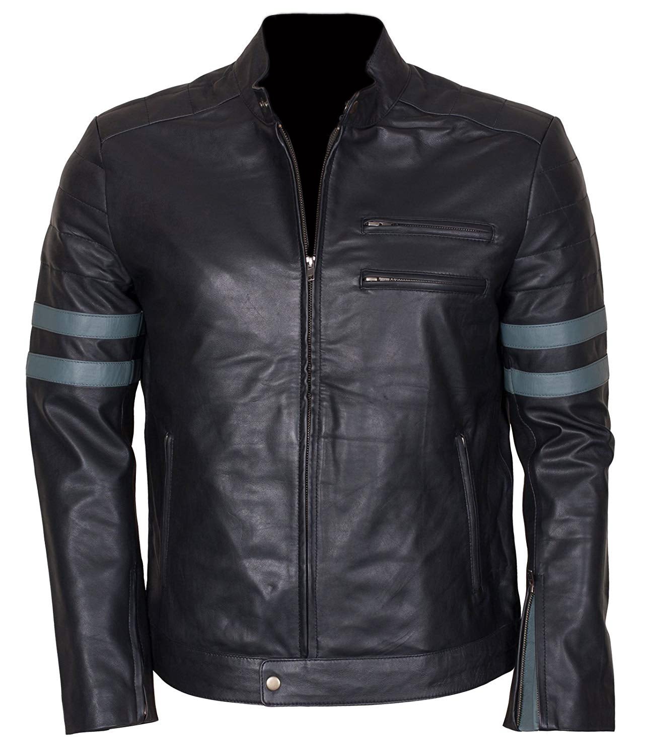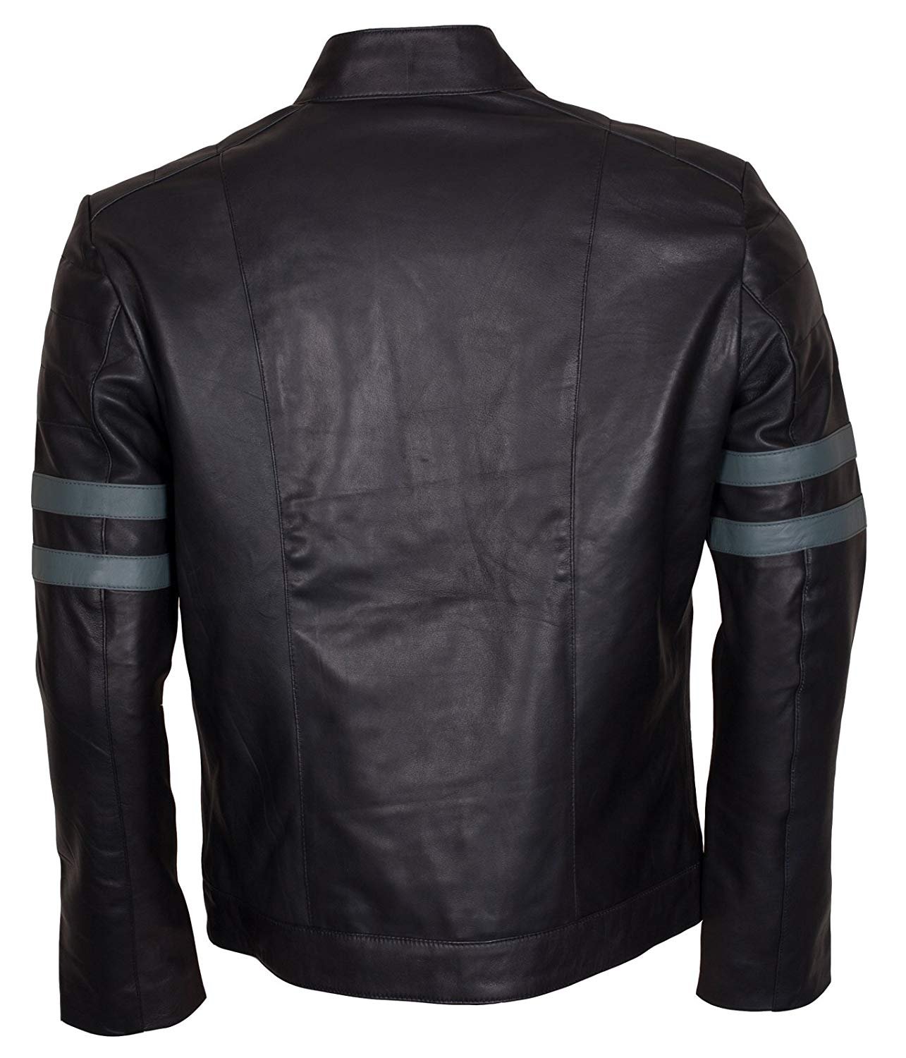 Men’s Black Leather Biker Jacket with Grey / Blue Racing Stripes Genuine Leather Motorcycle Jacket