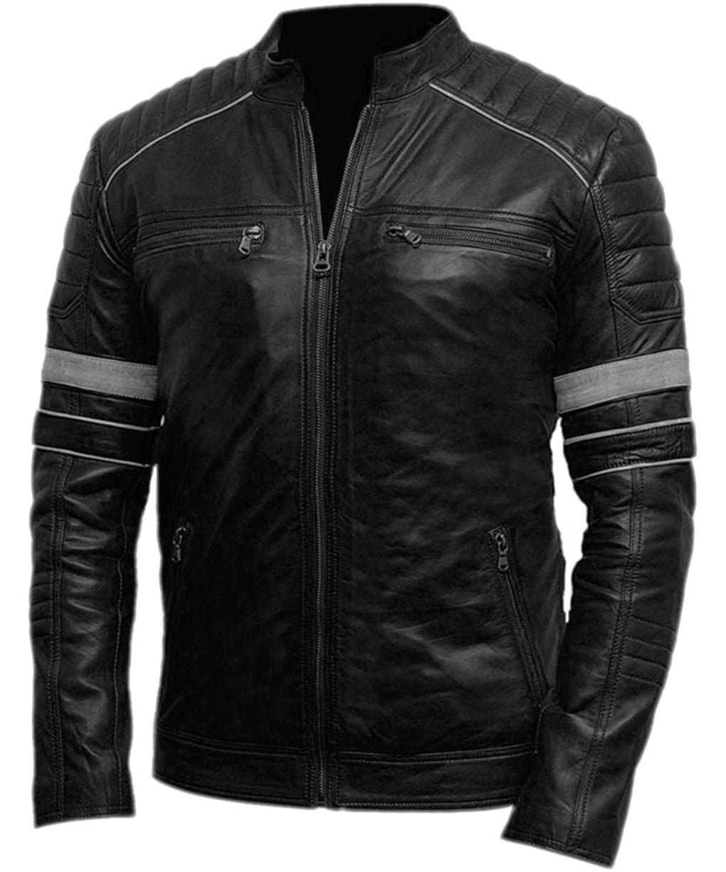 Men’s Black Leather Cafe Racer Jacket Grey Stripes & Quilted Shoulder Detailing