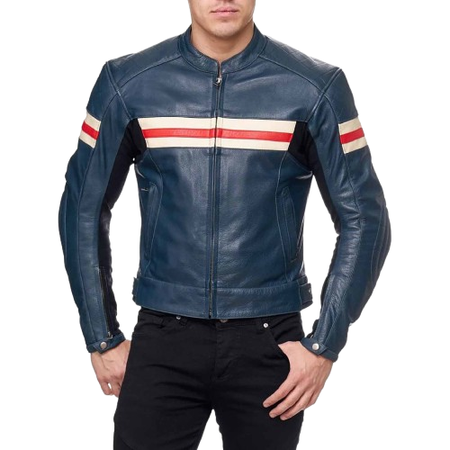 Men’s Blue Leather Cafe Racer Jacket with Red & White Stripes Motorcycle Biker Style