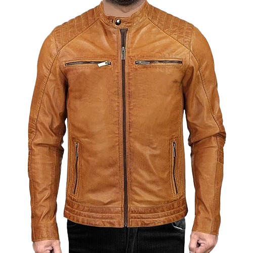 Men’s Brown Leather Biker Jacket with Quilted Shoulder Details Classic Motorcycle Jacket