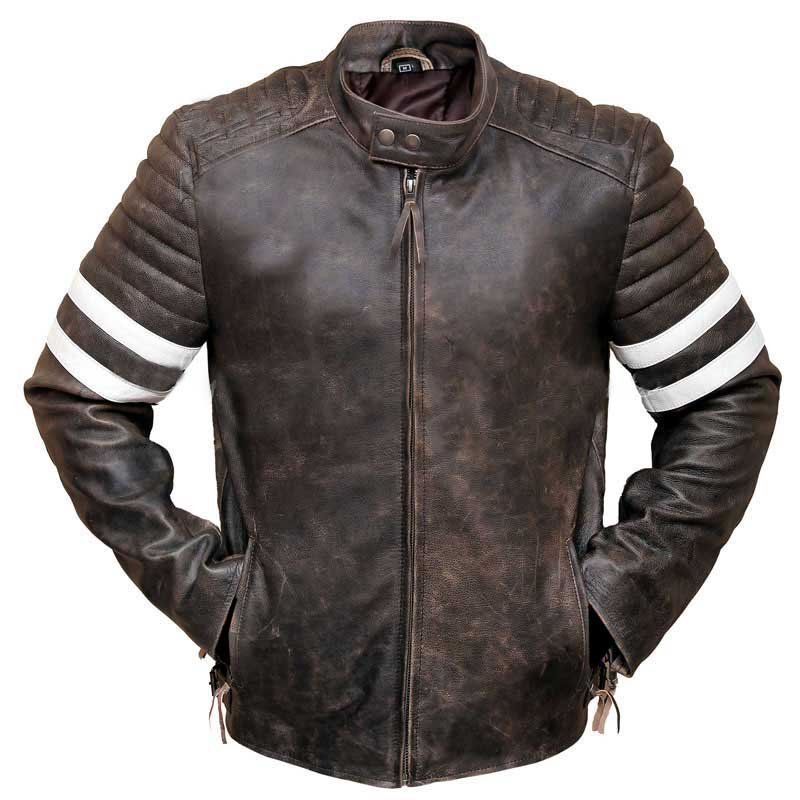Men’s Distressed Brown Leather Motorcycle Jacket with White Stripes