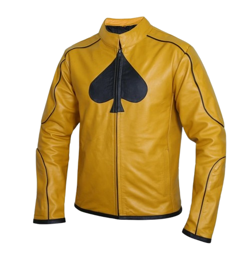 Stand out in style with this Men’s Mustard Yellow Leather Biker Jacket, crafted from premium genuine leather. Its bold mustard yellow color paired with a black spade logo creates a statement piece that’s both unique and fashion-forward.