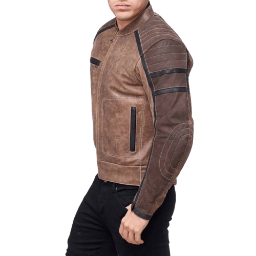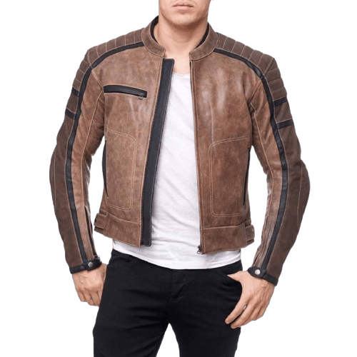 Men’s Vintage Brown Leather Biker Jacket Retro Café Racer Motorcycle Jacket with Black Stripe Detailing