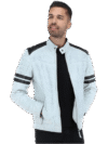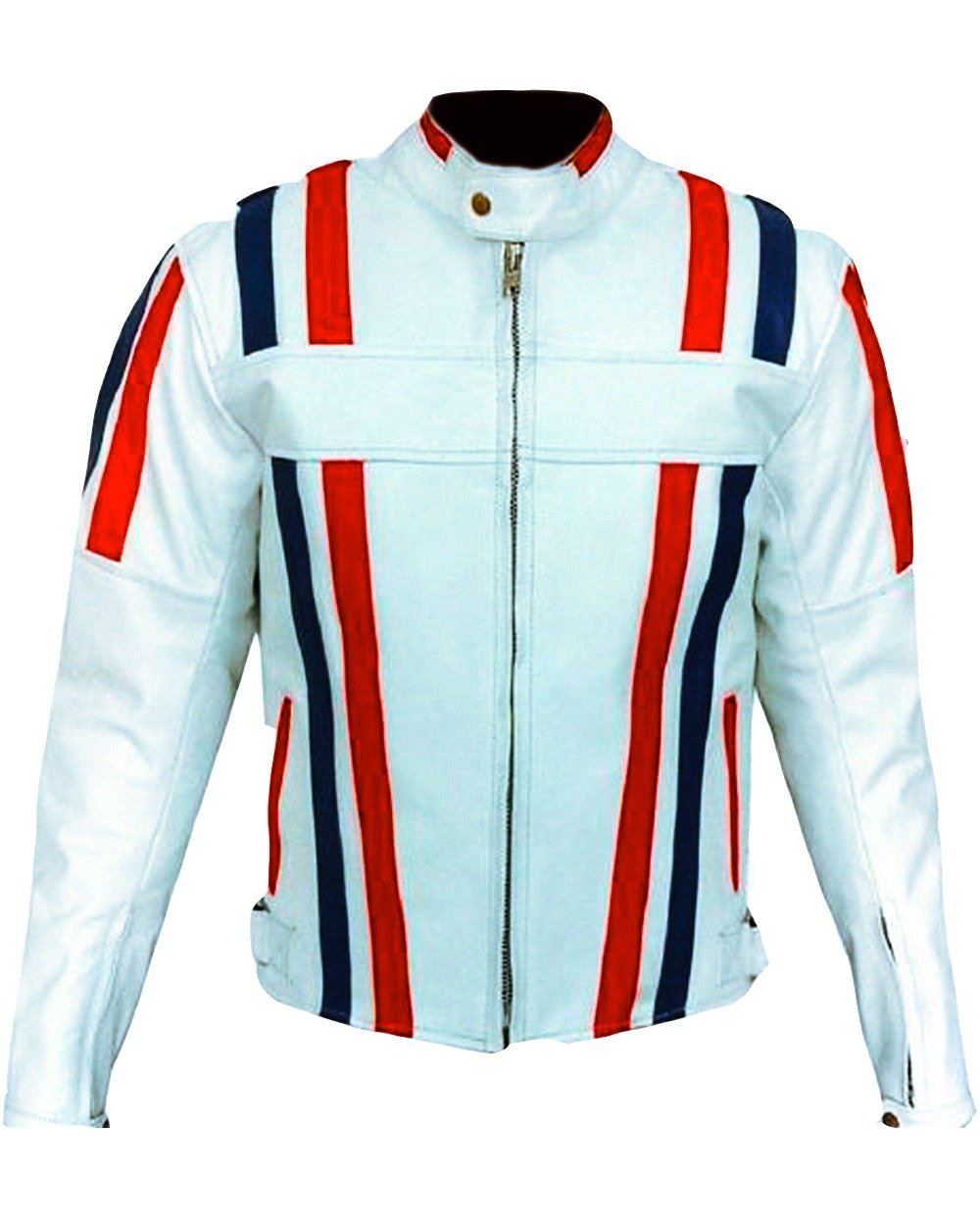 Men’s White Leather Café Racer Jacket with Red & Blue Stripes