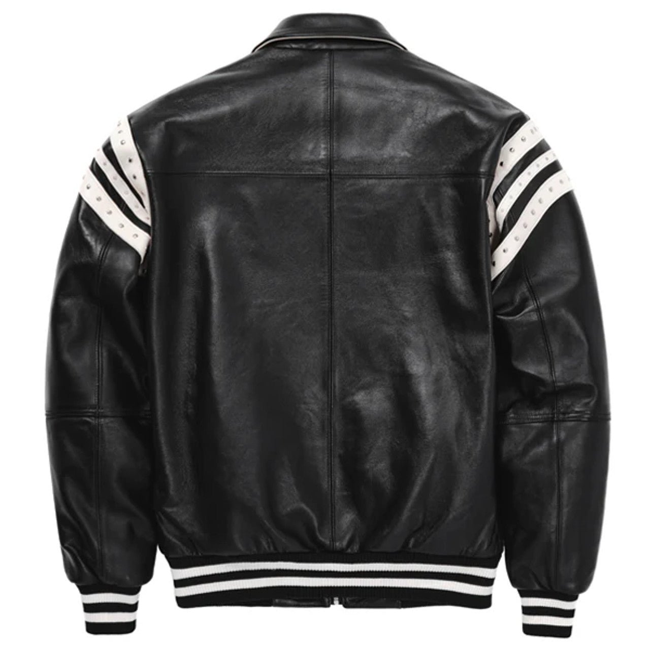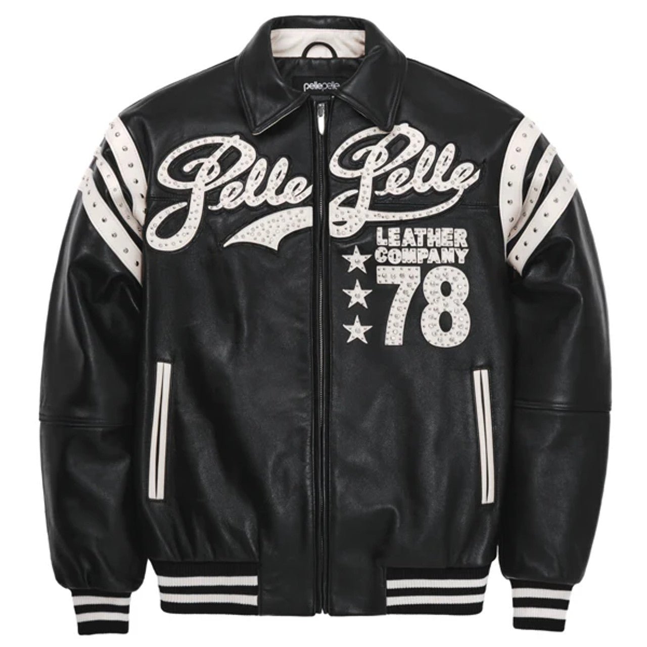 - Front View: A striking design with classic varsity jacket elements, encrusted embellishments, intricate embroidery, and a front button or snap closure. The jacket often includes Pelle Pelle branding and distinctive detailing such as patches or other embellishments.