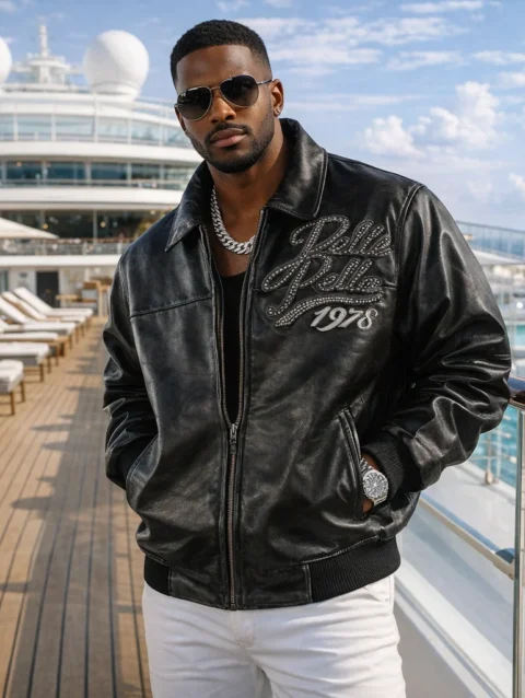 - Front View: A sleek black leather design with a front zipper or button closure. The jacket often includes Pelle Pelle branding and unique design elements that enhance its sophisticated appearance.