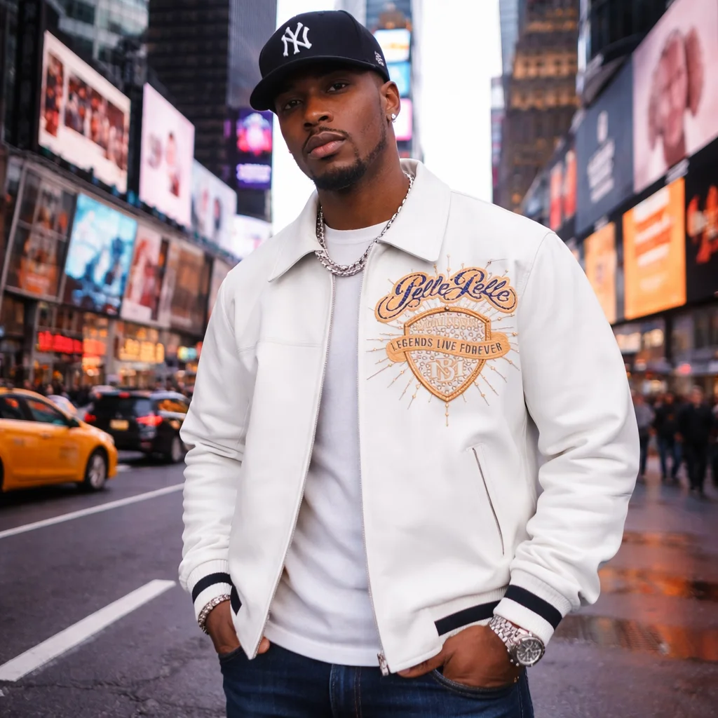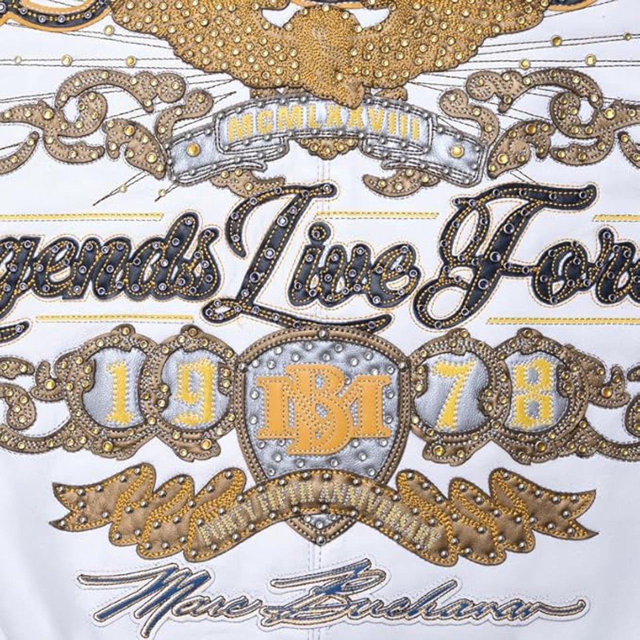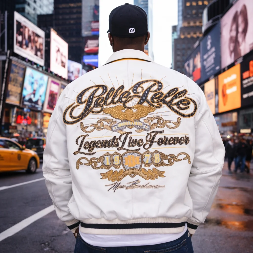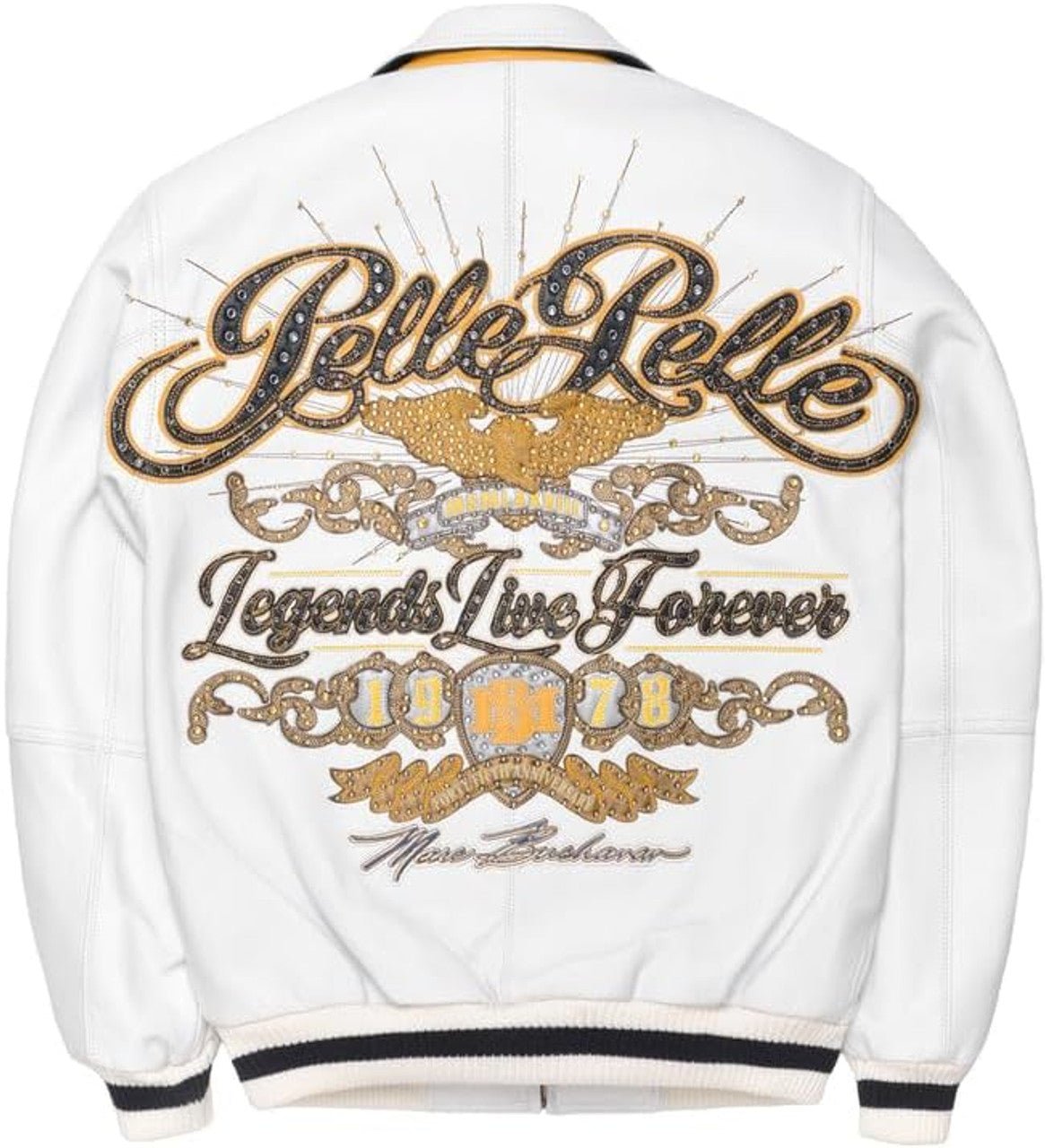 Overall, the Pelle Pelle Legends Live Forever White Studs Jacket is a luxurious and edgy fashion statement that combines high-quality craftsmanship with bold design elements, perfect for those who want to celebrate legendary style.