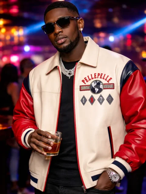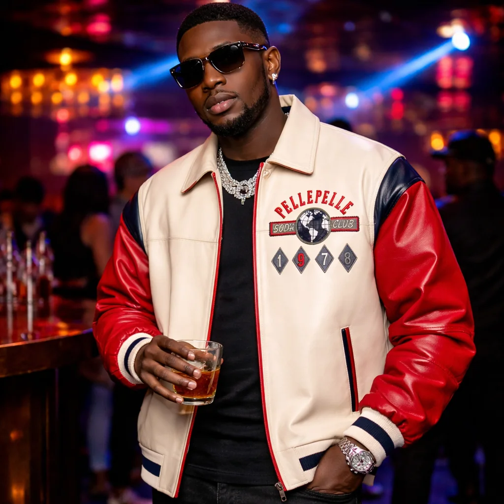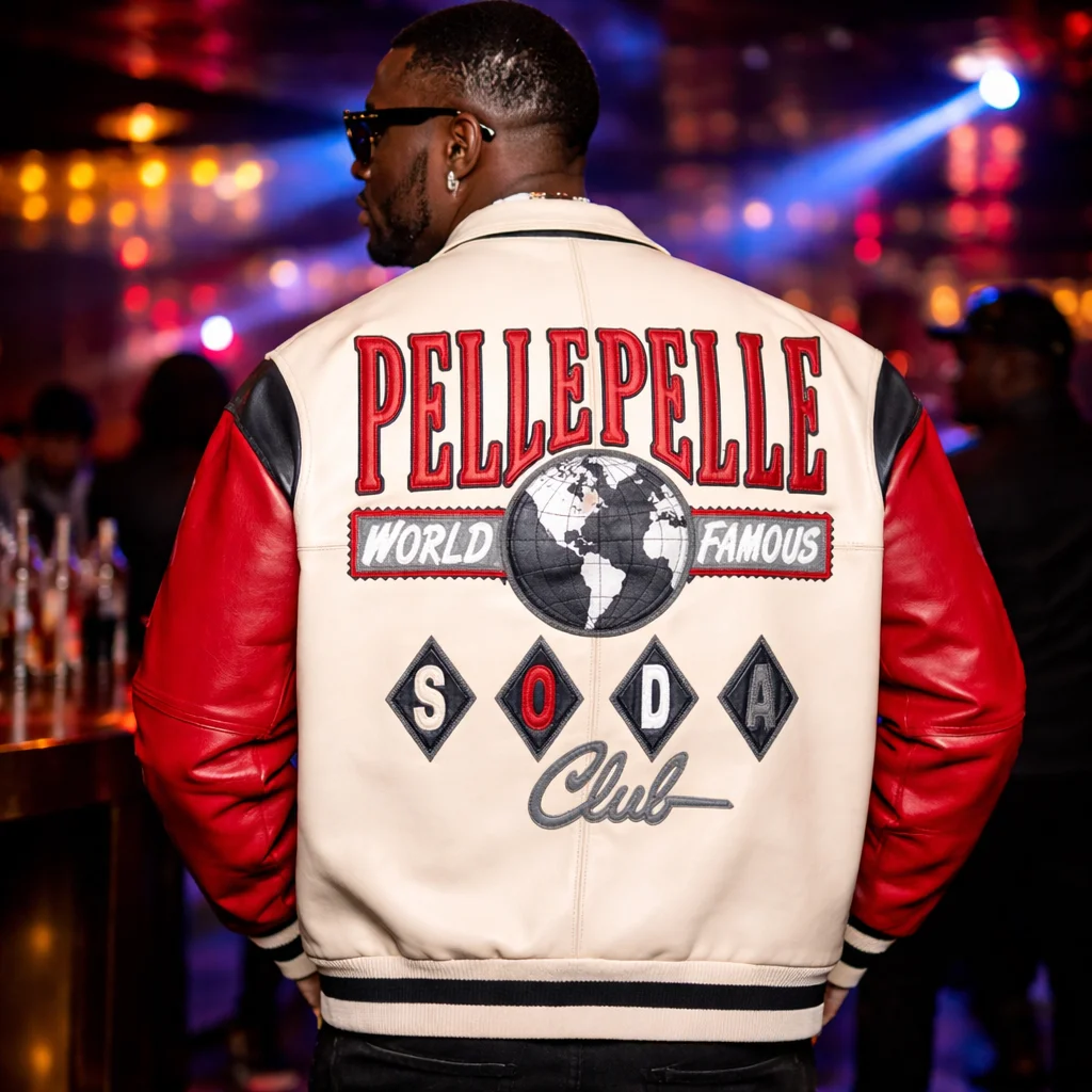 - Front View: A dynamic design with classic varsity jacket elements, bold Soda Club graphics, intricate embroidery, plush finish, and a front button or snap closure. The jacket often includes Pelle Pelle branding and distinctive detailing such as patches or other embellishments.