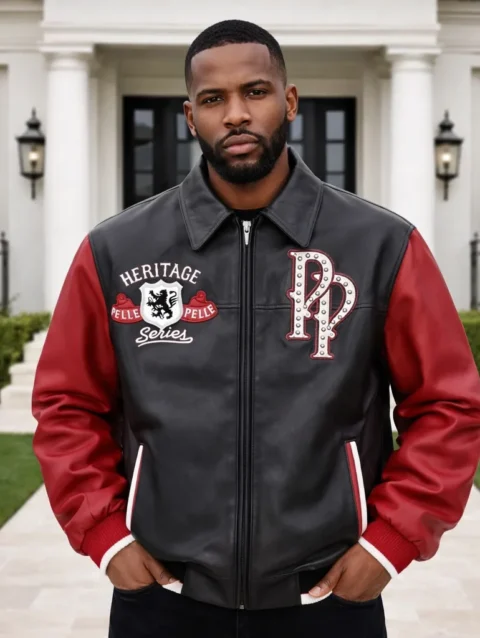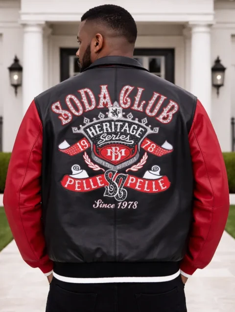 - Front View: A striking design with classic varsity jacket elements, World Tour graphics, intricate embroidery, plush finish, and a front button or snap closure. The jacket often includes Pelle Pelle branding and distinctive detailing such as patches or other embellishments.