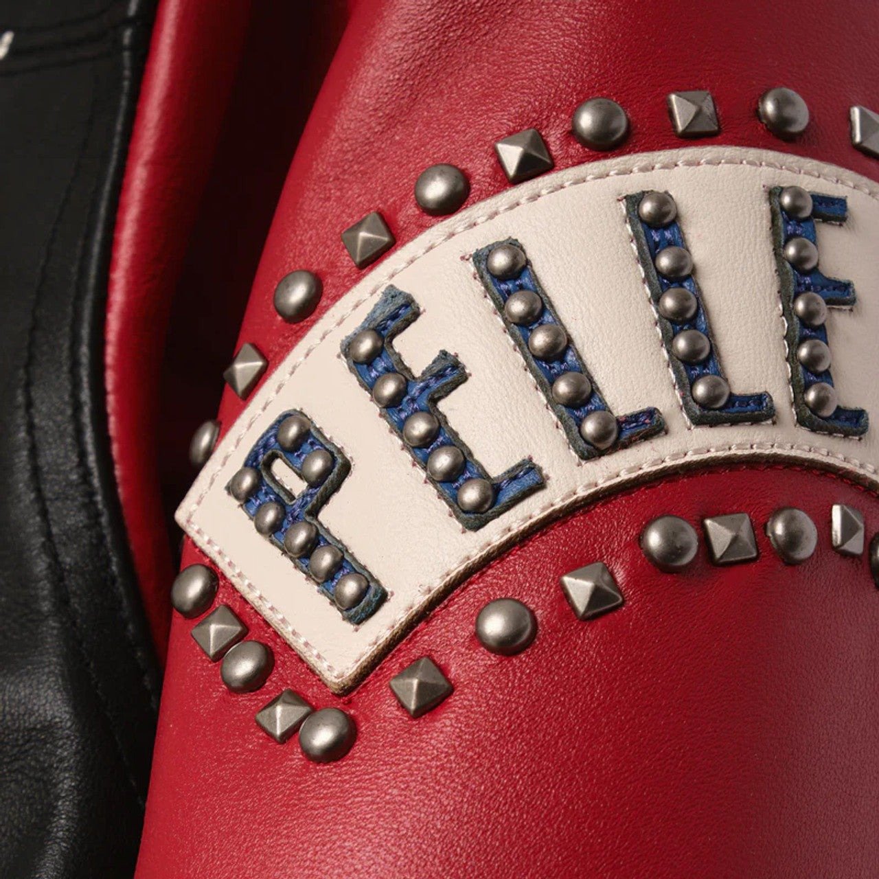 - Front View: A dynamic design with bold world tour graphics, intricate embroidery, and a front zipper or button closure. The jacket often includes Pelle Pelle branding and distinctive detailing such as patches or other embellishments.