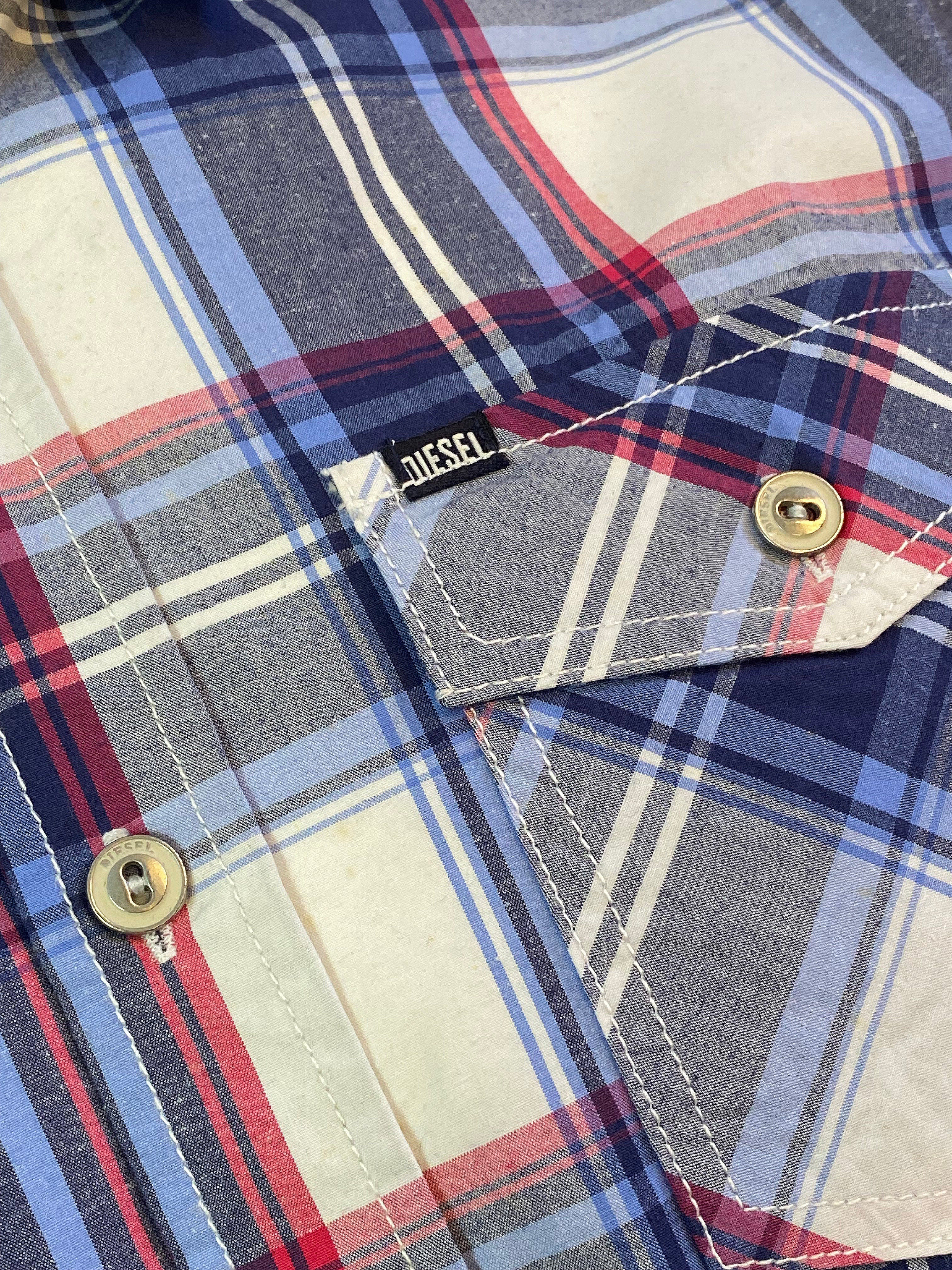 Introducing a high-end, premium quality shirt from Diesel. This half-sleeved cotton shirt showcases a fine check pattern in a tasteful combination of white, blue, and grey. It's not just a shirt, it's a testament to Diesel's commitment to quality and style. The shirt features Diesel's signature tags and logo, and even the buttons are exclusively Diesel. This shirt is more than just clothing, it's a statement piece designed for those who appreciate the finer things in life.