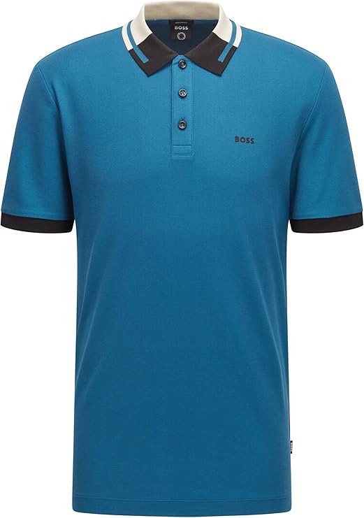 This Hugo Boss polo shirt is the epitome of style and sophistication. The vibrant blue color catches the eye, while the contrasting white collar adds a touch of elegance. The bold blue and black stripes on the sleeves give it a modern twist. And of course, the iconic Hugo logo proudly displayed on the chest adds a touch of luxury. It's the perfect combination of comfort, quality, and fashion-forward design. You'll definitely make a statement wherever you go wearing this premium polo shirt! 🌟👕