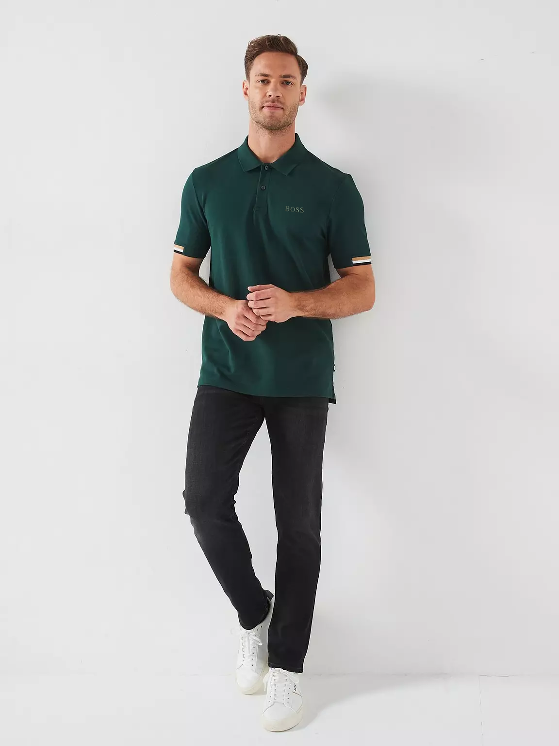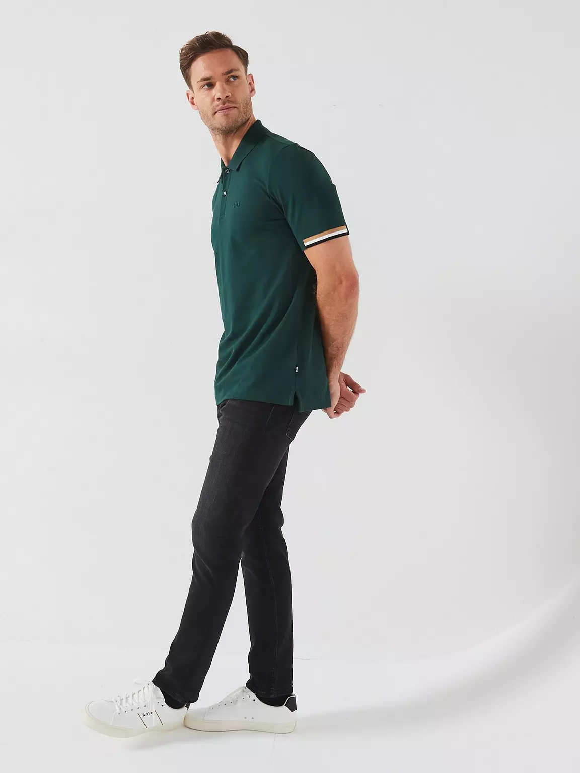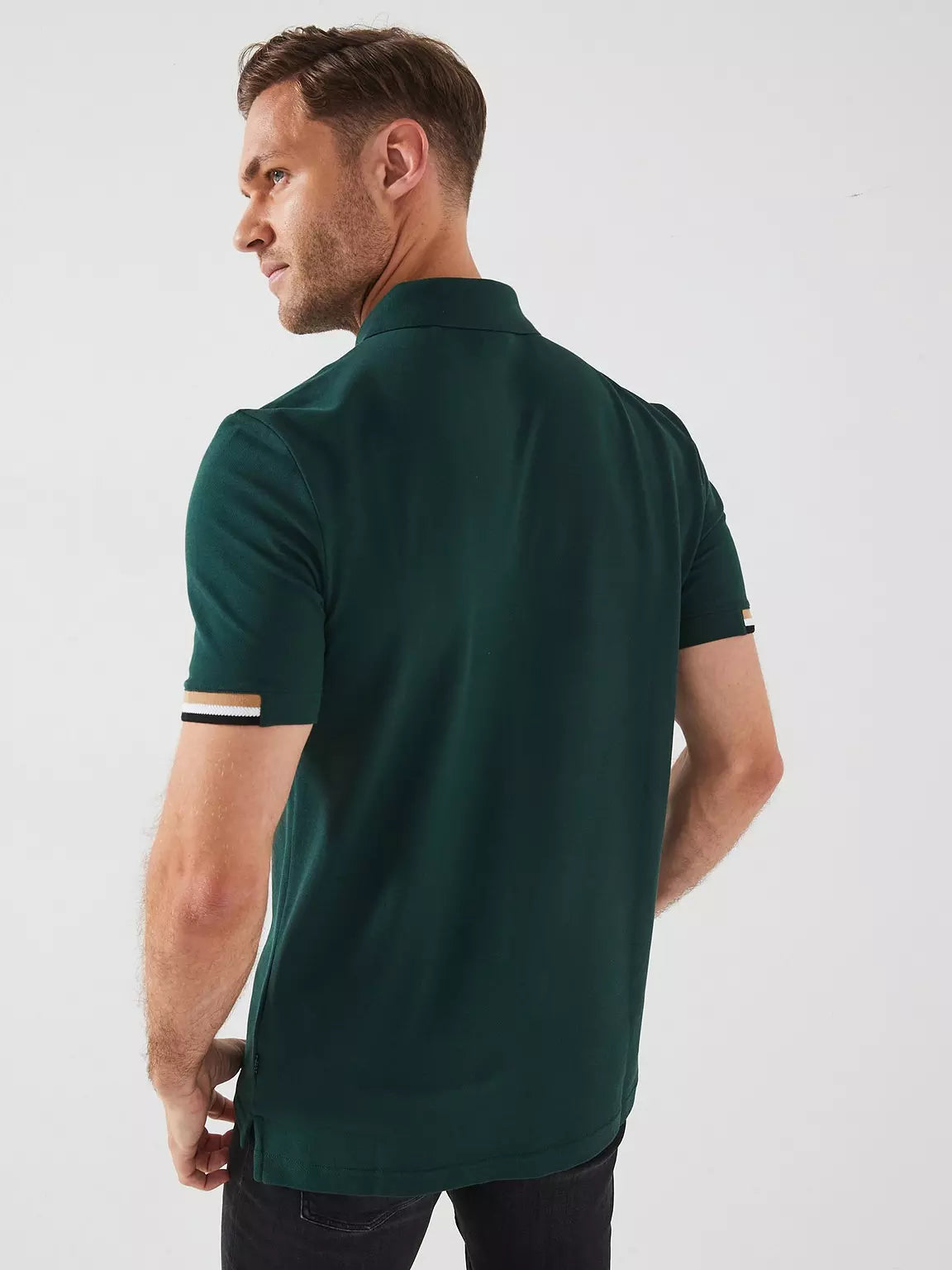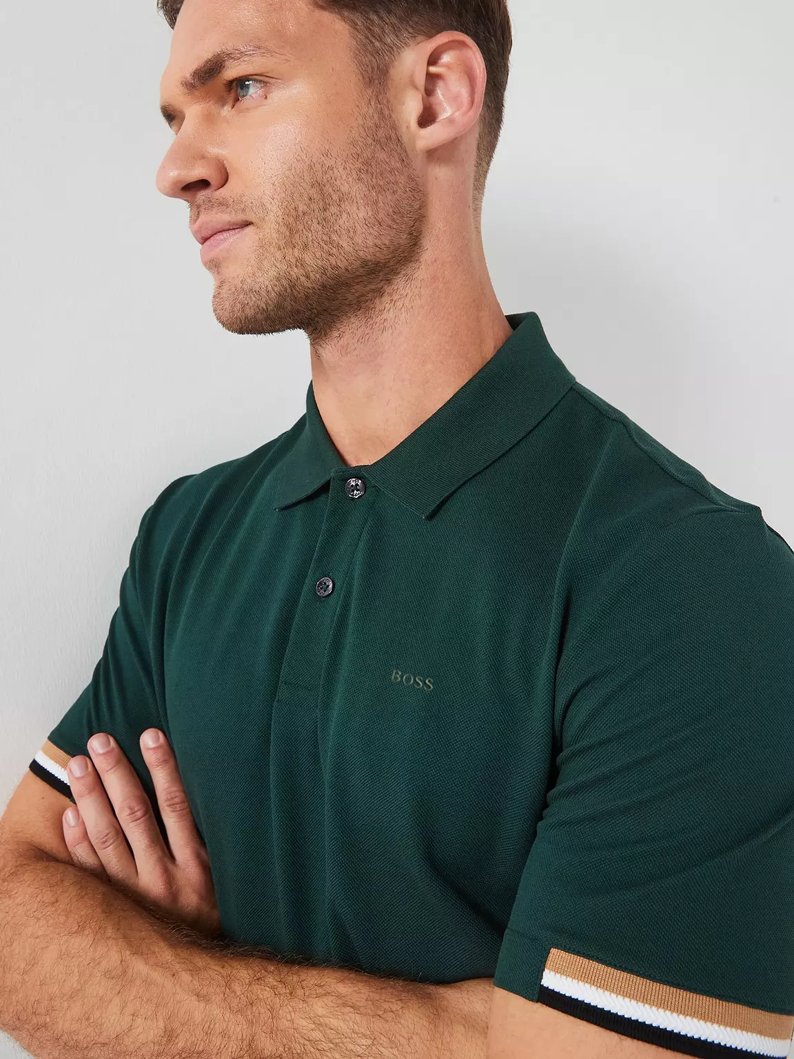 This Hugo Boss polo shirt in a beautiful dark green color is truly stunning. It features a plain design with the iconic Boss logo. The collar is adorned with lines and has 'Boss' written on it, adding a touch of elegance to this classic piece.