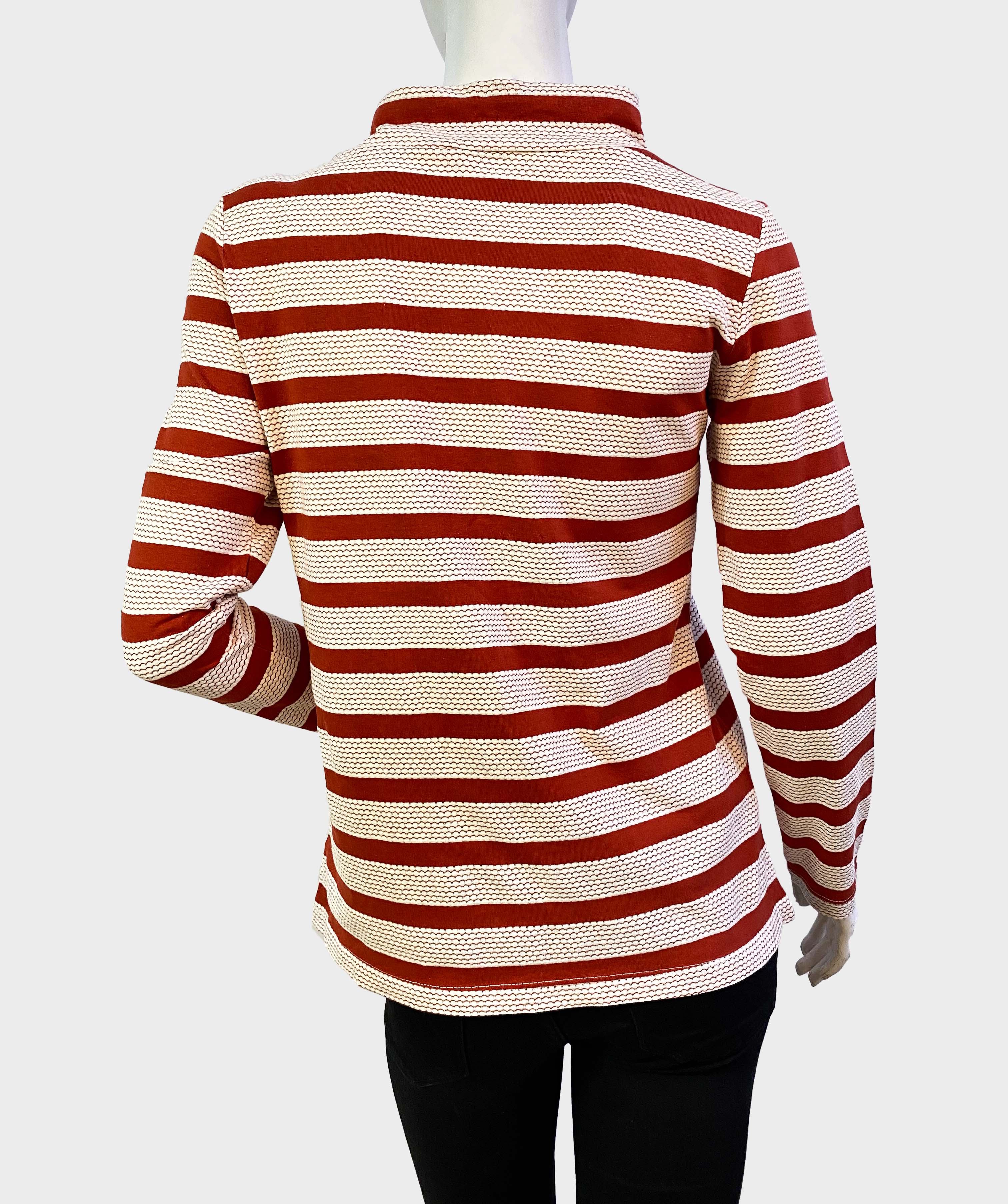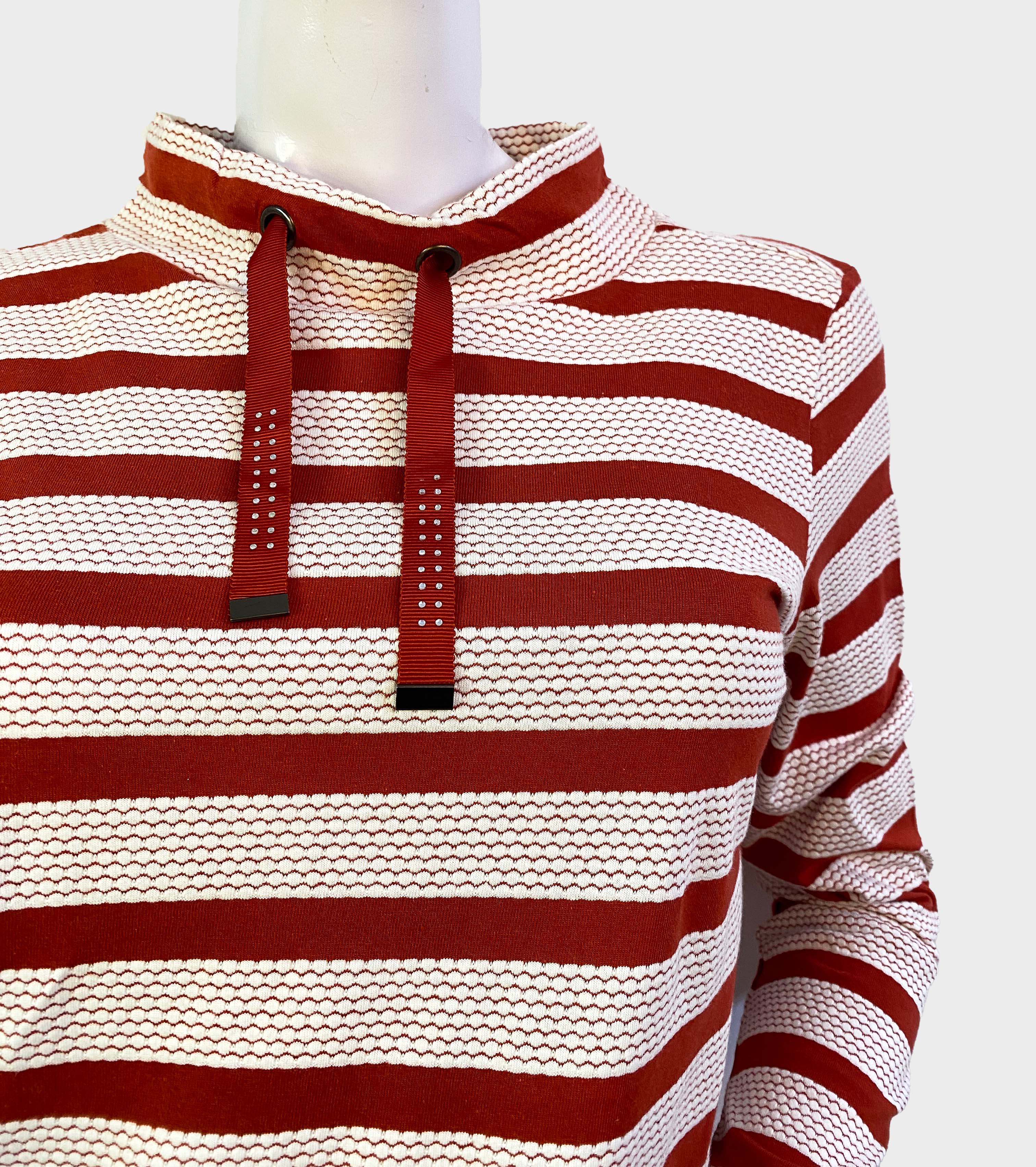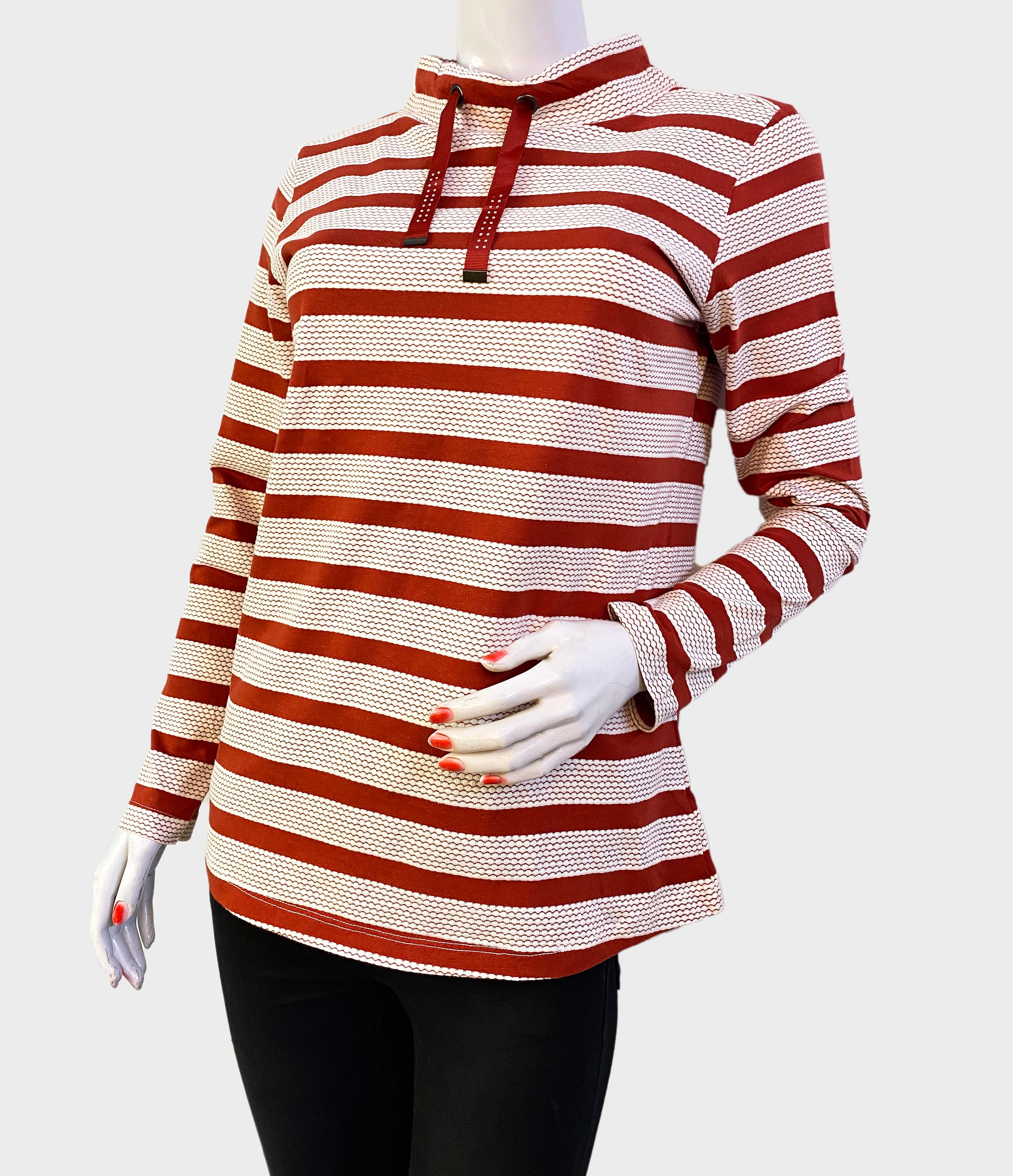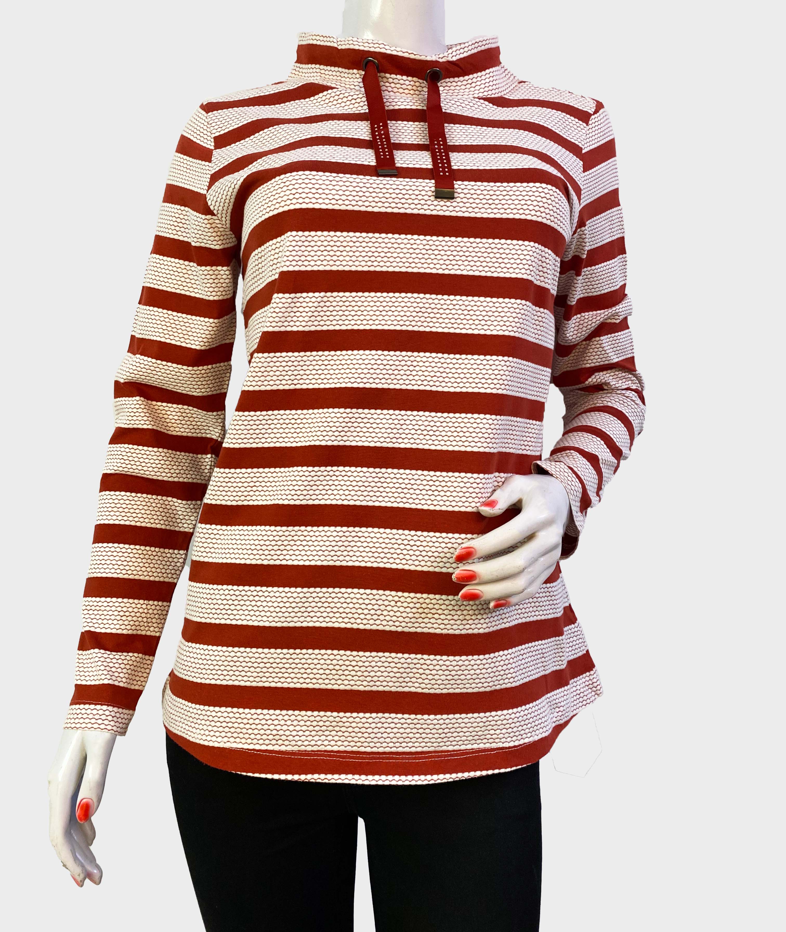 Expertly crafted in Bangladesh, the LAURA TORELLI STRIPED PRINTED TOP boasts a striking red and white design. Perfect for any occasion, this top is stylish, versatile, and made with the highest quality materials. Elevate your wardrobe with this timeless addition.