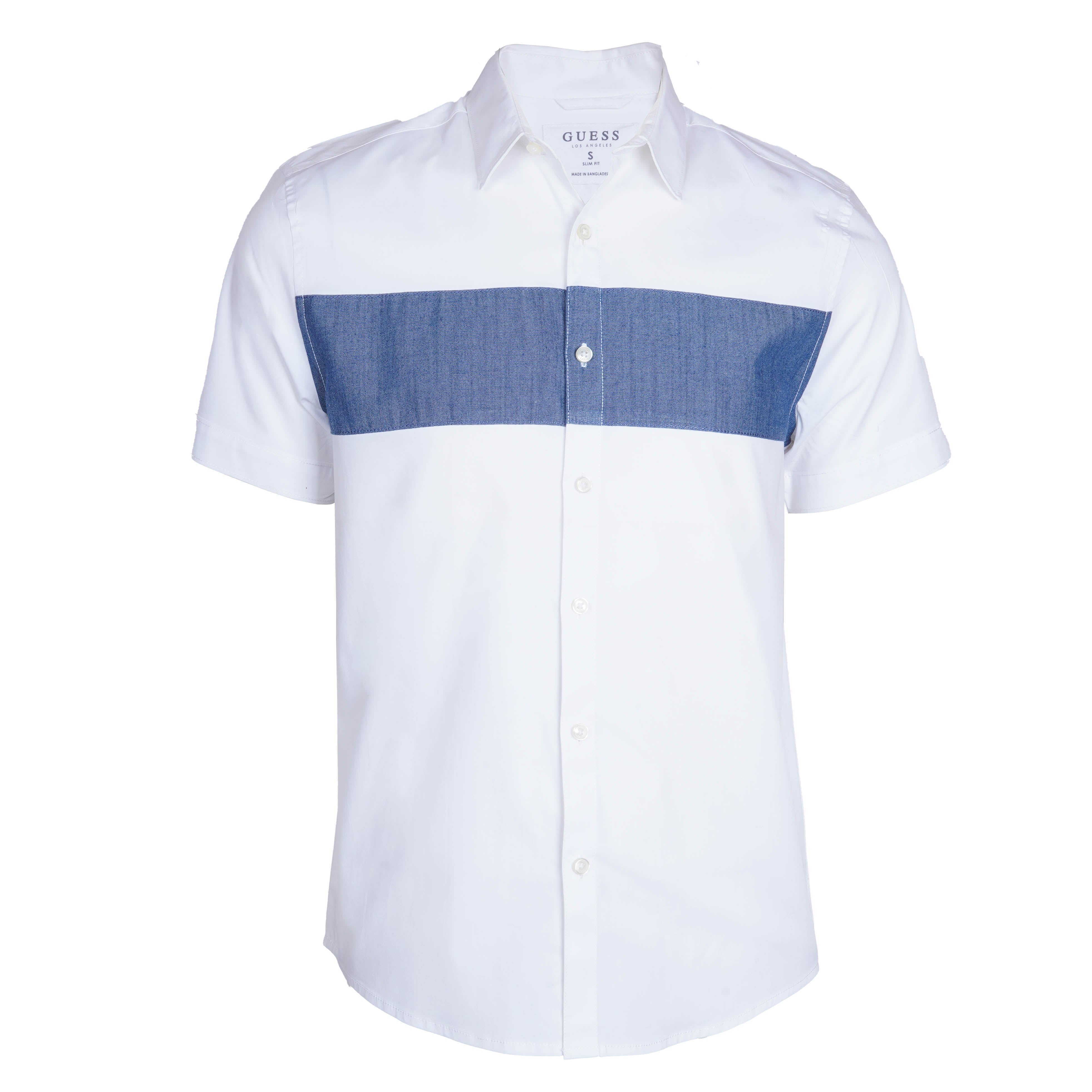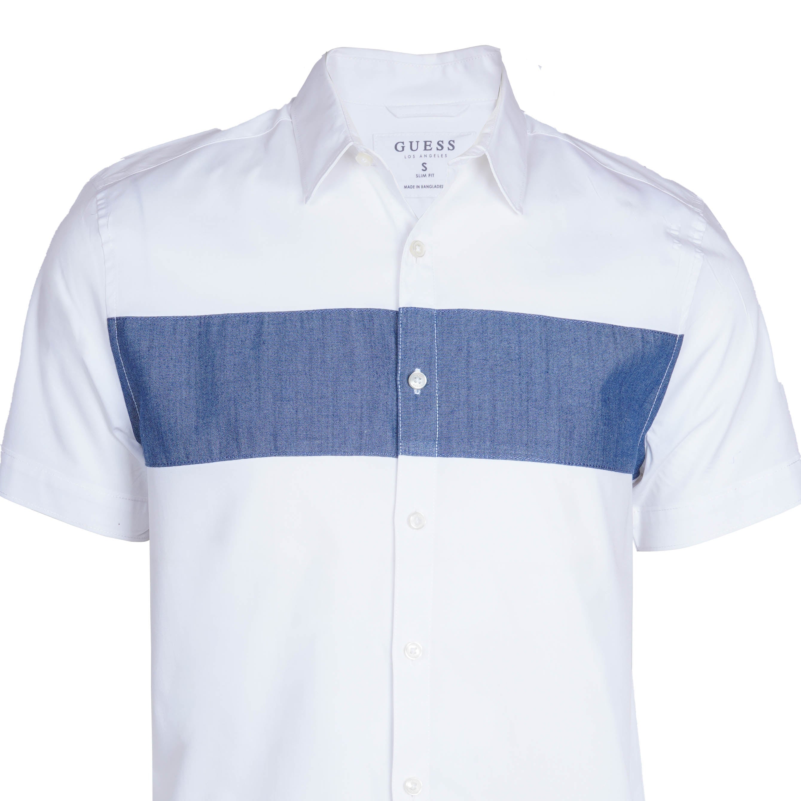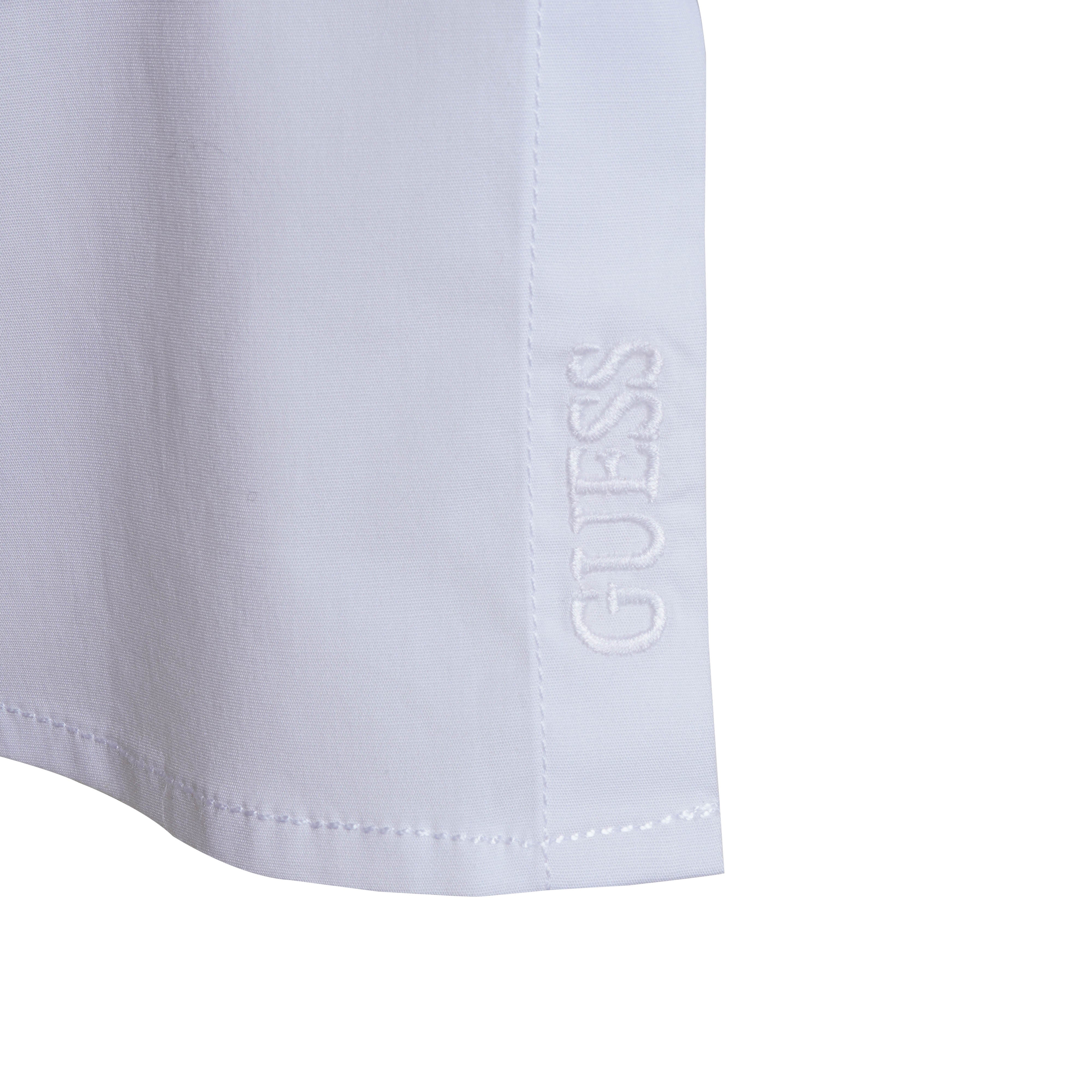 This is a stylish half-sleeve shirt from Guess. Crafted in Bangladesh, it's made from breathable cotton with a touch of denim. The white color adds a crisp, clean look. It's designed for a slim fit, offering a flattering silhouette. The shirt is adorned with a small, embroidered Guess logo, adding a touch of charm and showcasing the brand's identity. Overall, it's a lovely piece that combines comfort and style.