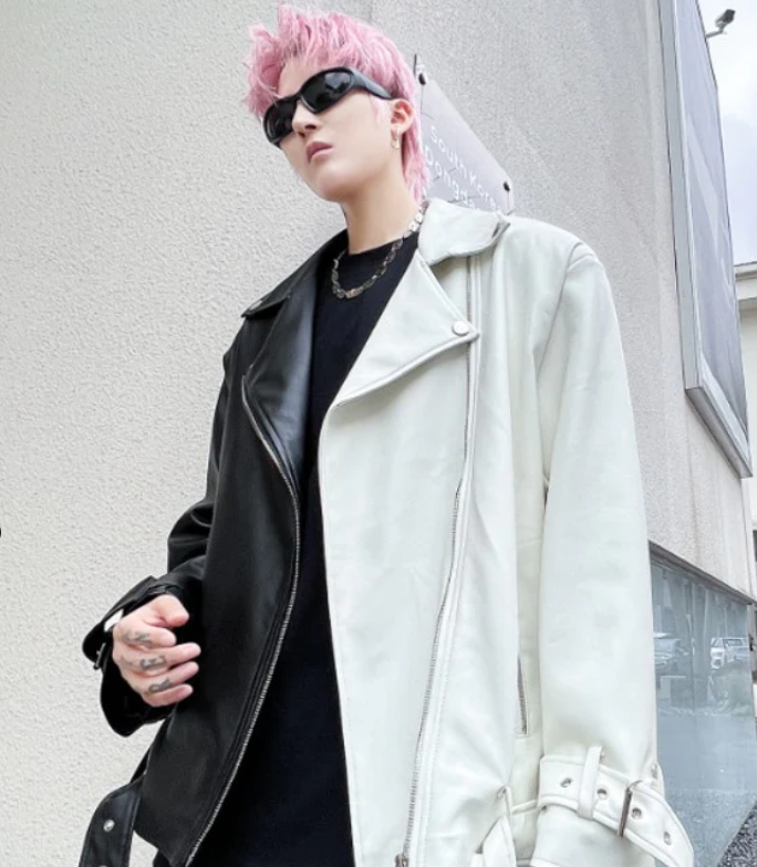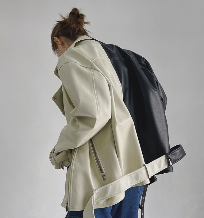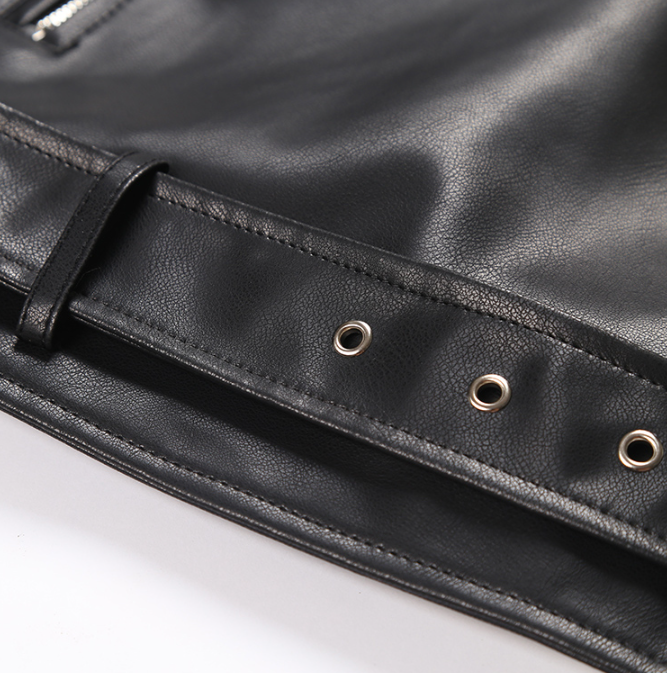 A classic oversized vegan leather blazer style in midi length. Large oversized pockets at front with button closure. Cross over at front with zipper.