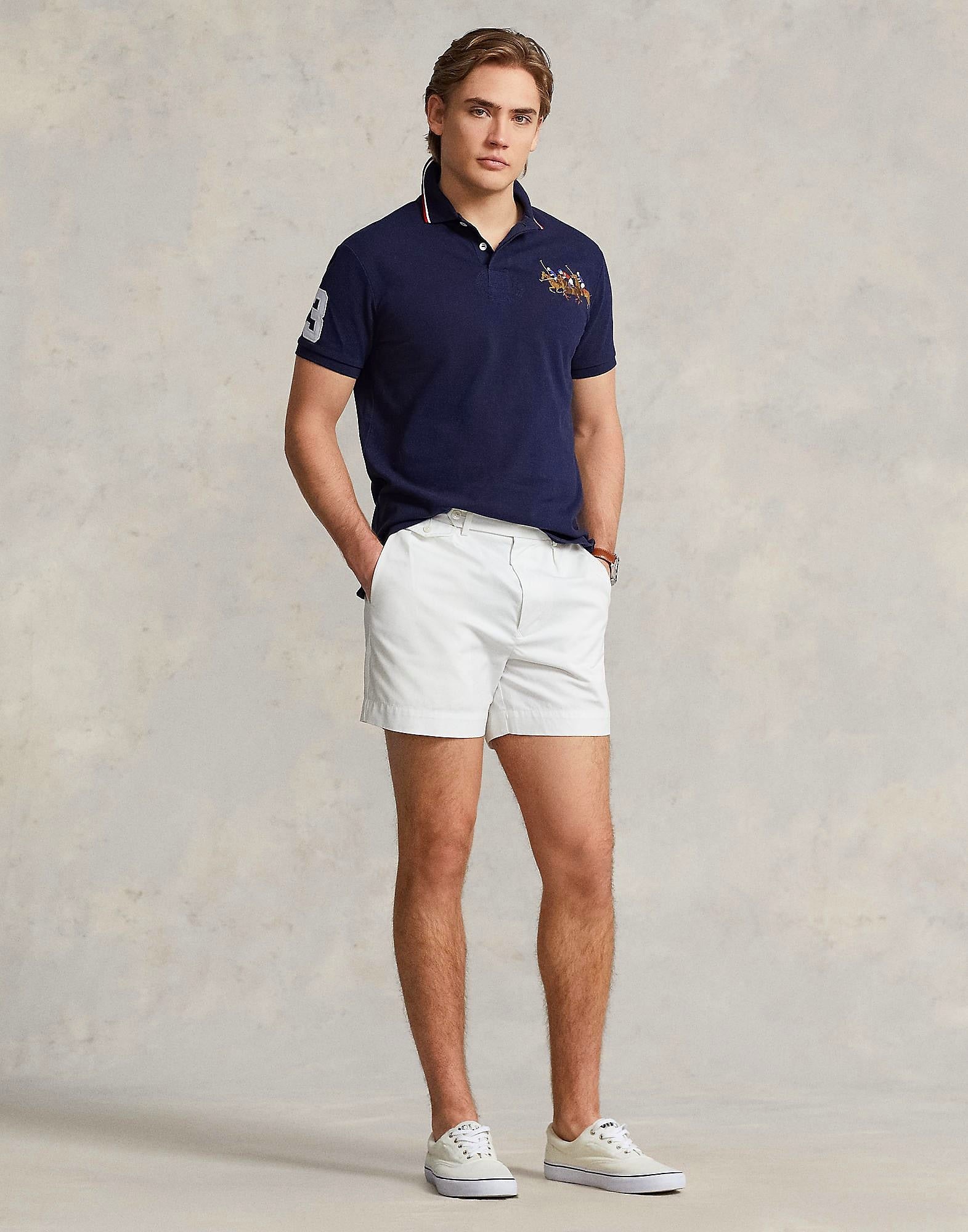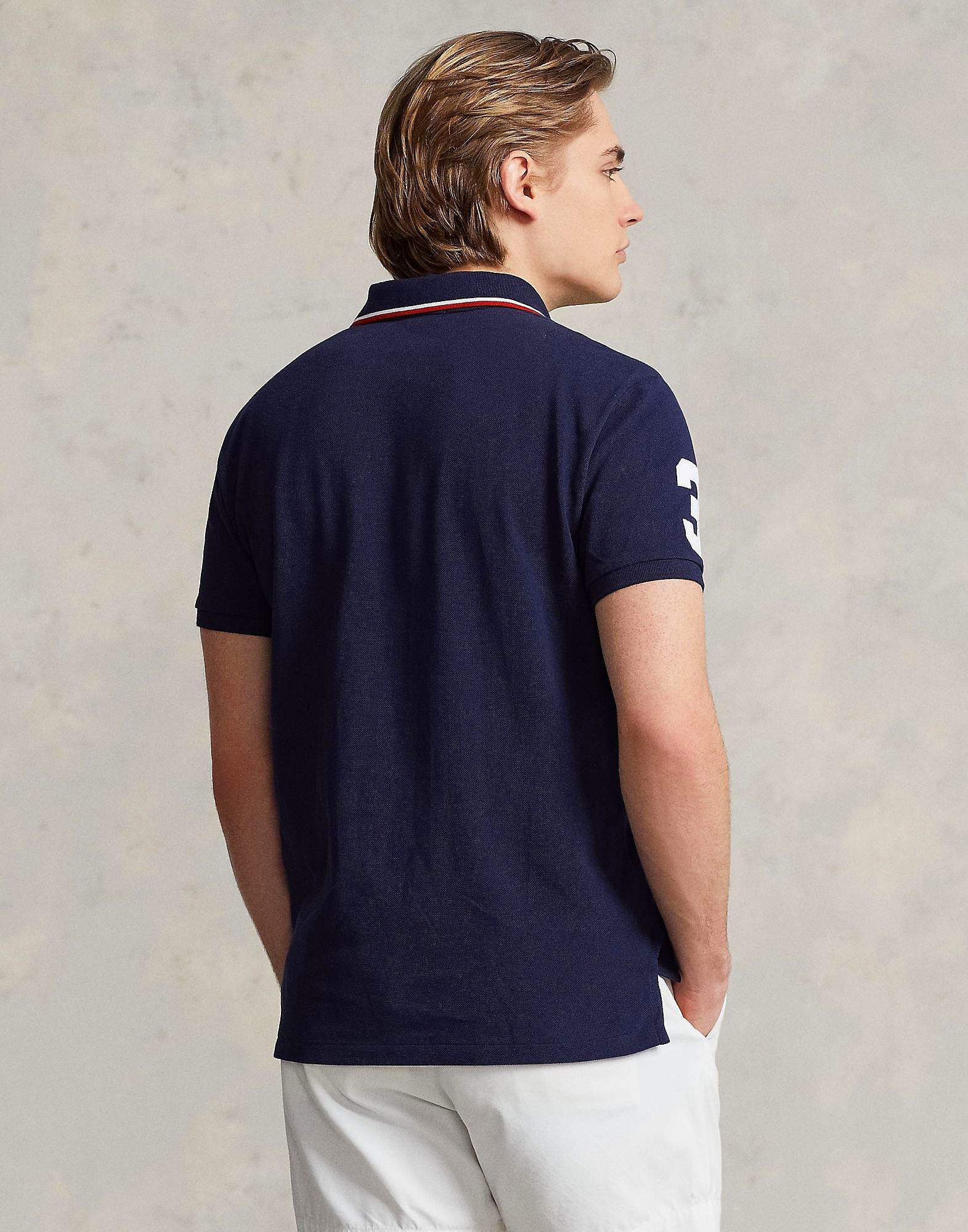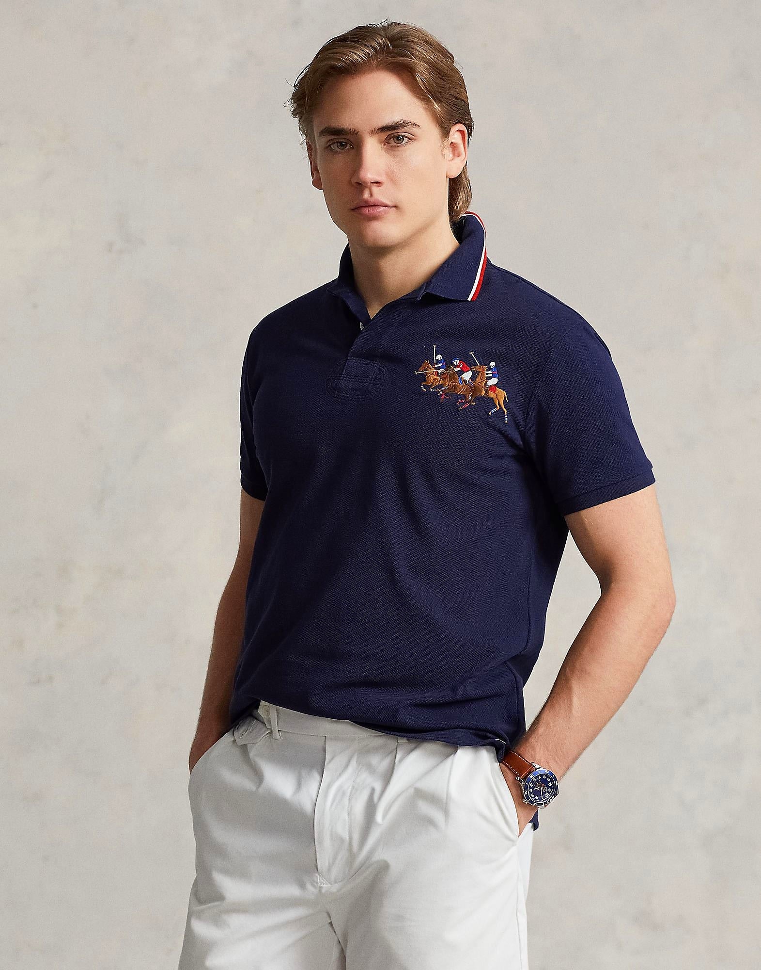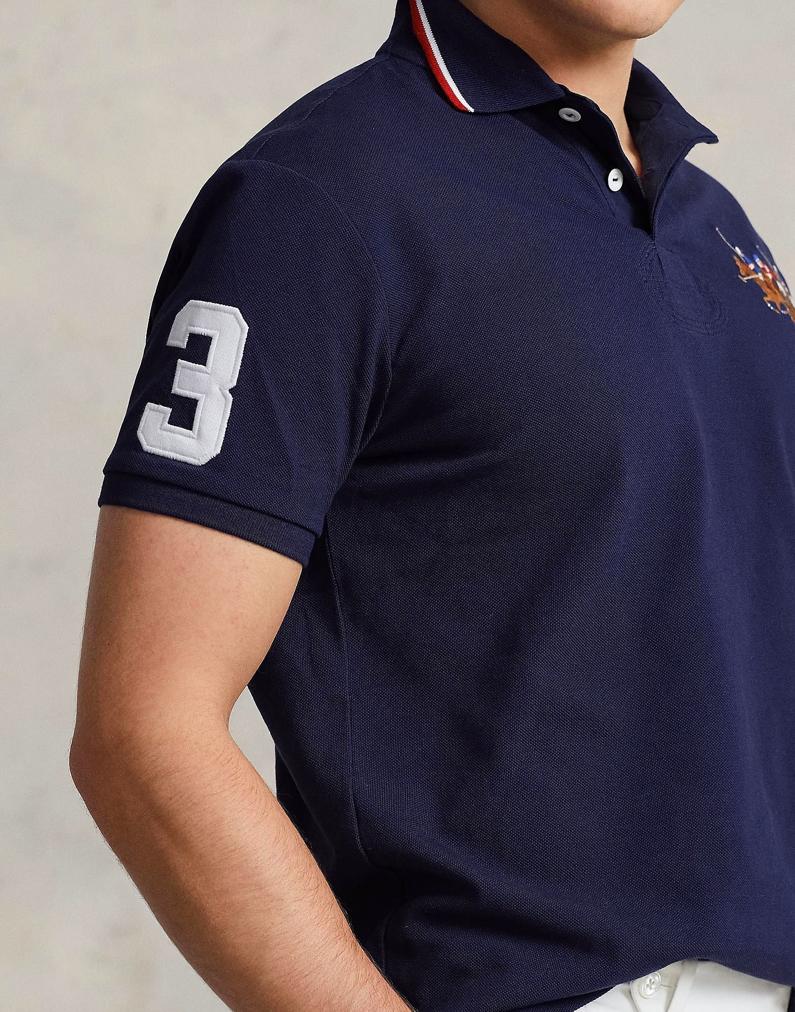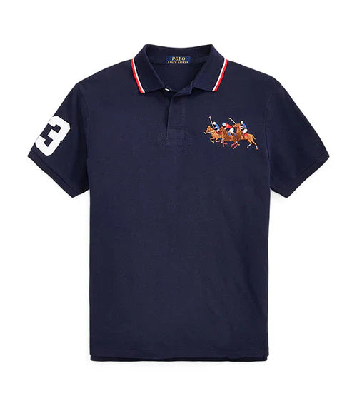 This polo shirt, from the R.A.L.P.H L.A.U.R.E.N brand, features a custom fit and a triple pony design on a navy background. It is expertly made in Bangladesh, providing exceptional quality and style.