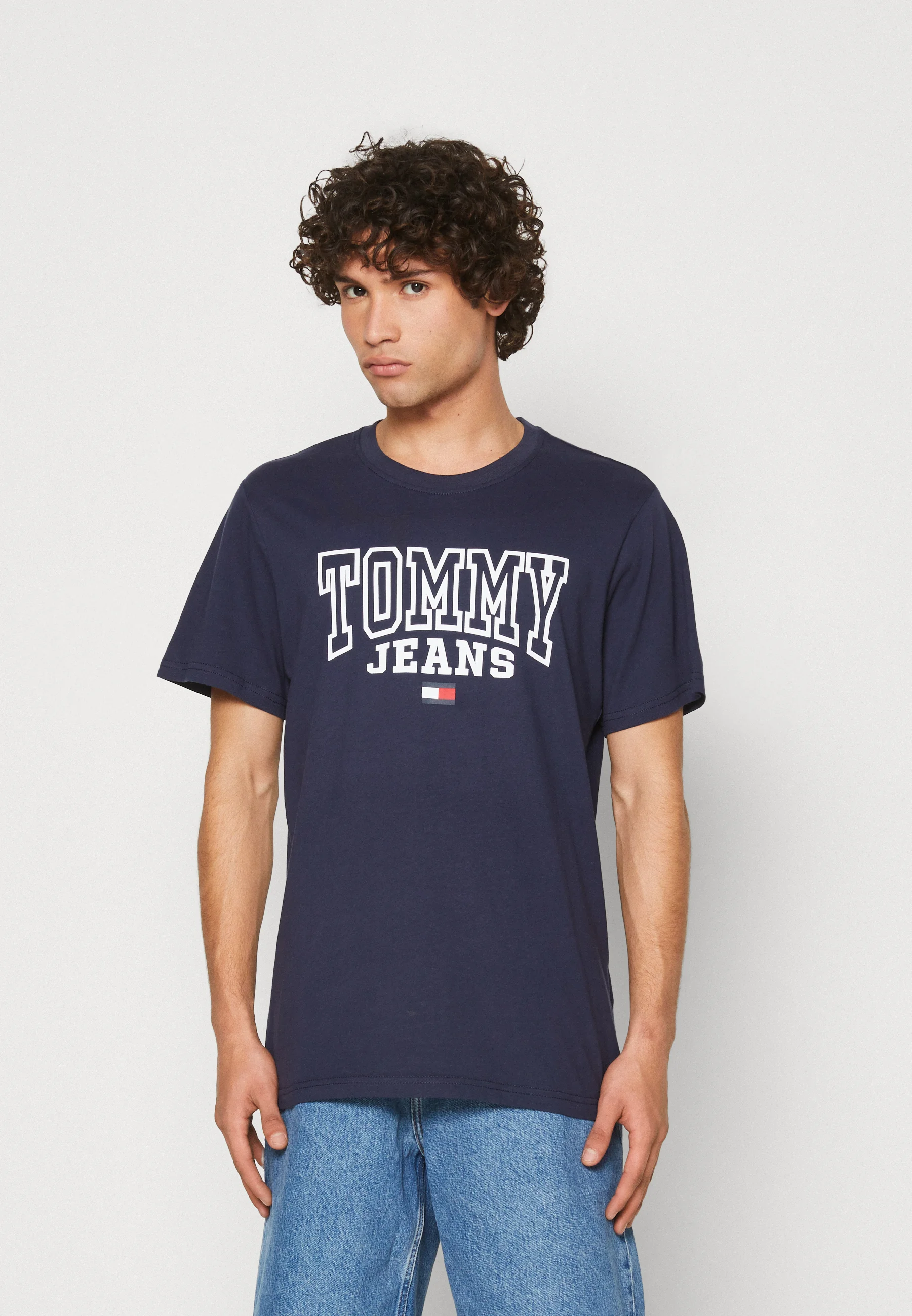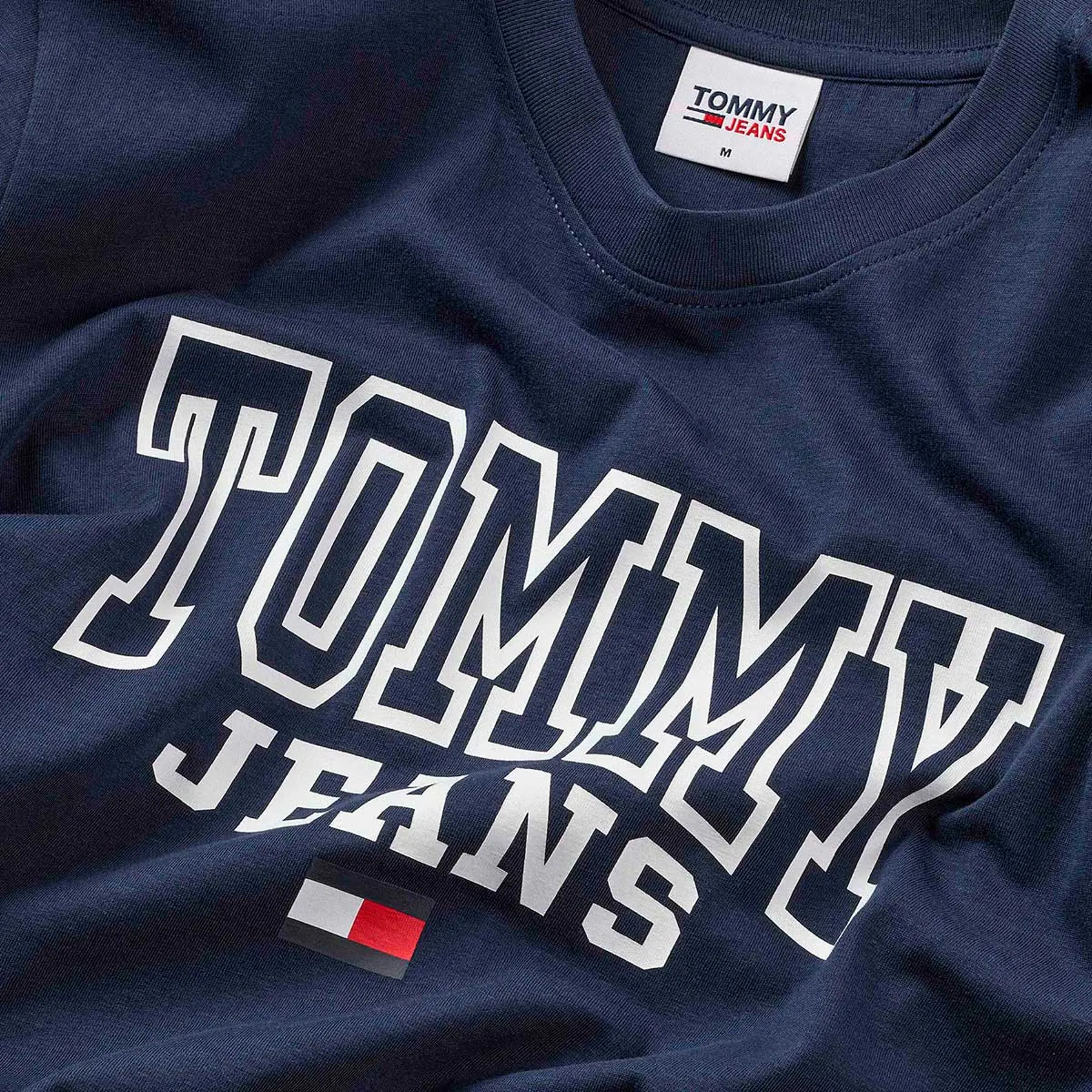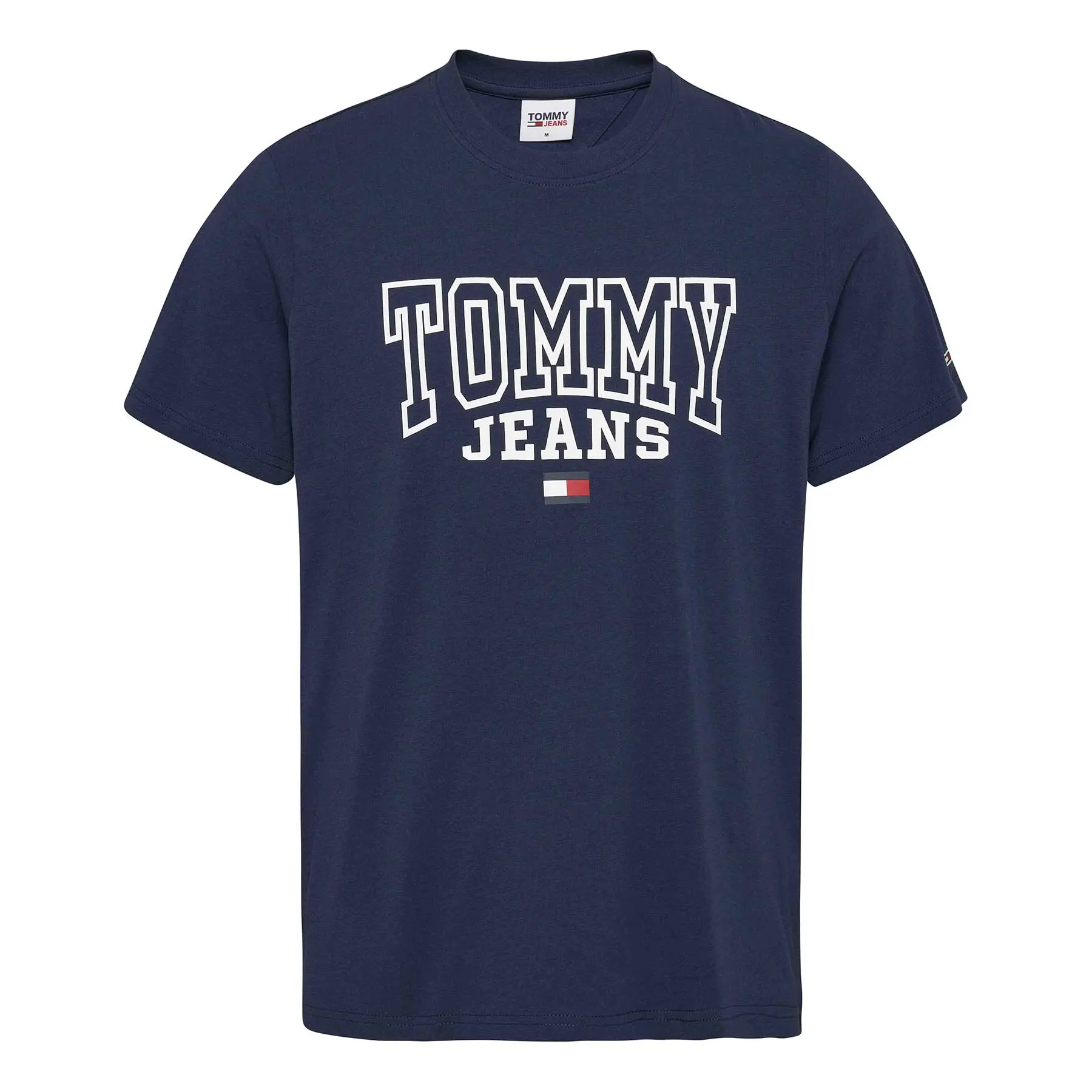 This is an exquisite navy t-shirt from the renowned brand, Tommy Hilfiger. Manufactured in Bangladesh, it proudly boasts the classic Tommy Jeans logo along with the flag. The design is both stylish and timeless, making it a must-have piece in any wardrobe. Its beauty lies in its simplicity and the brand's attention to detail. It's more than just a t-shirt, it's a fashion statement!
