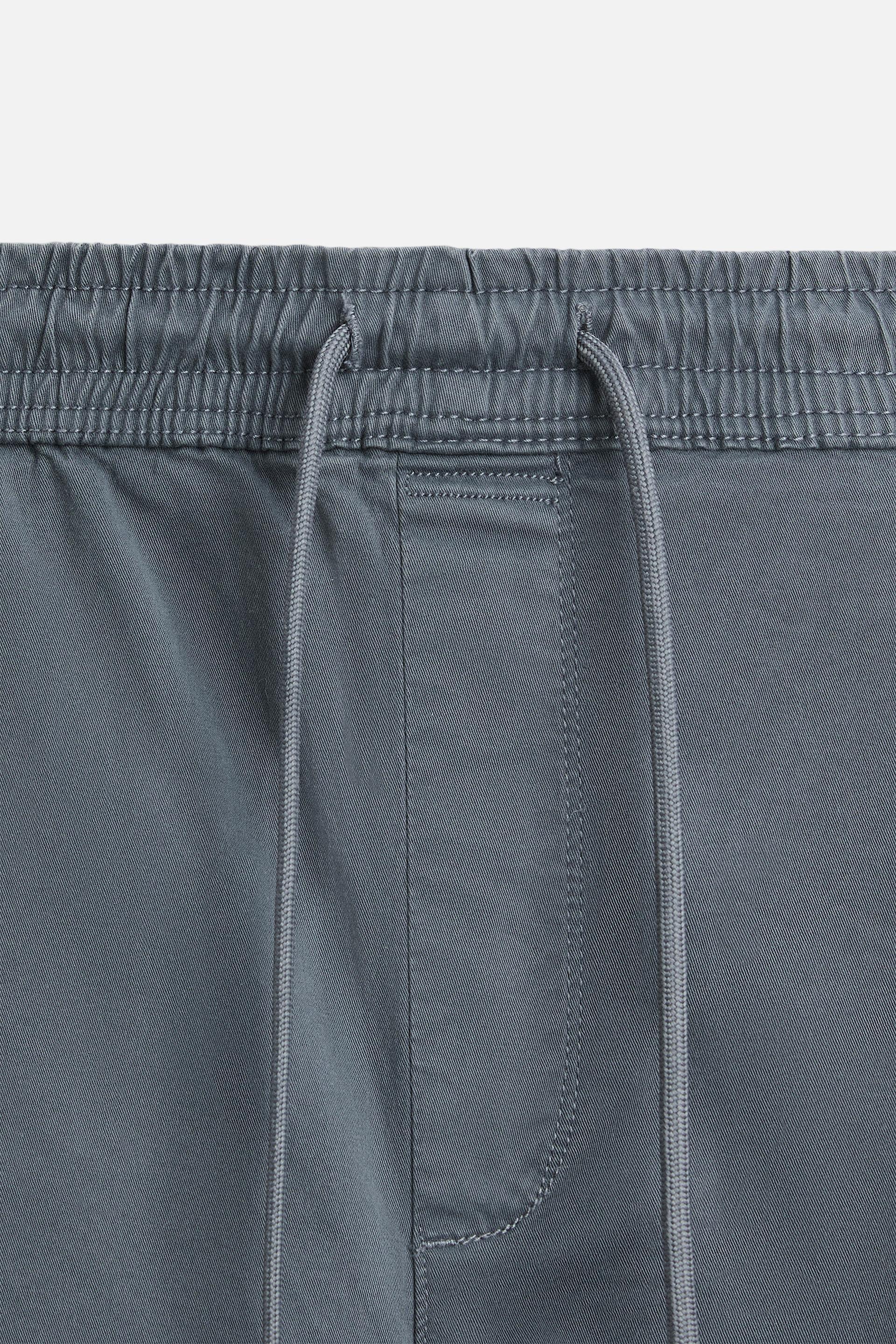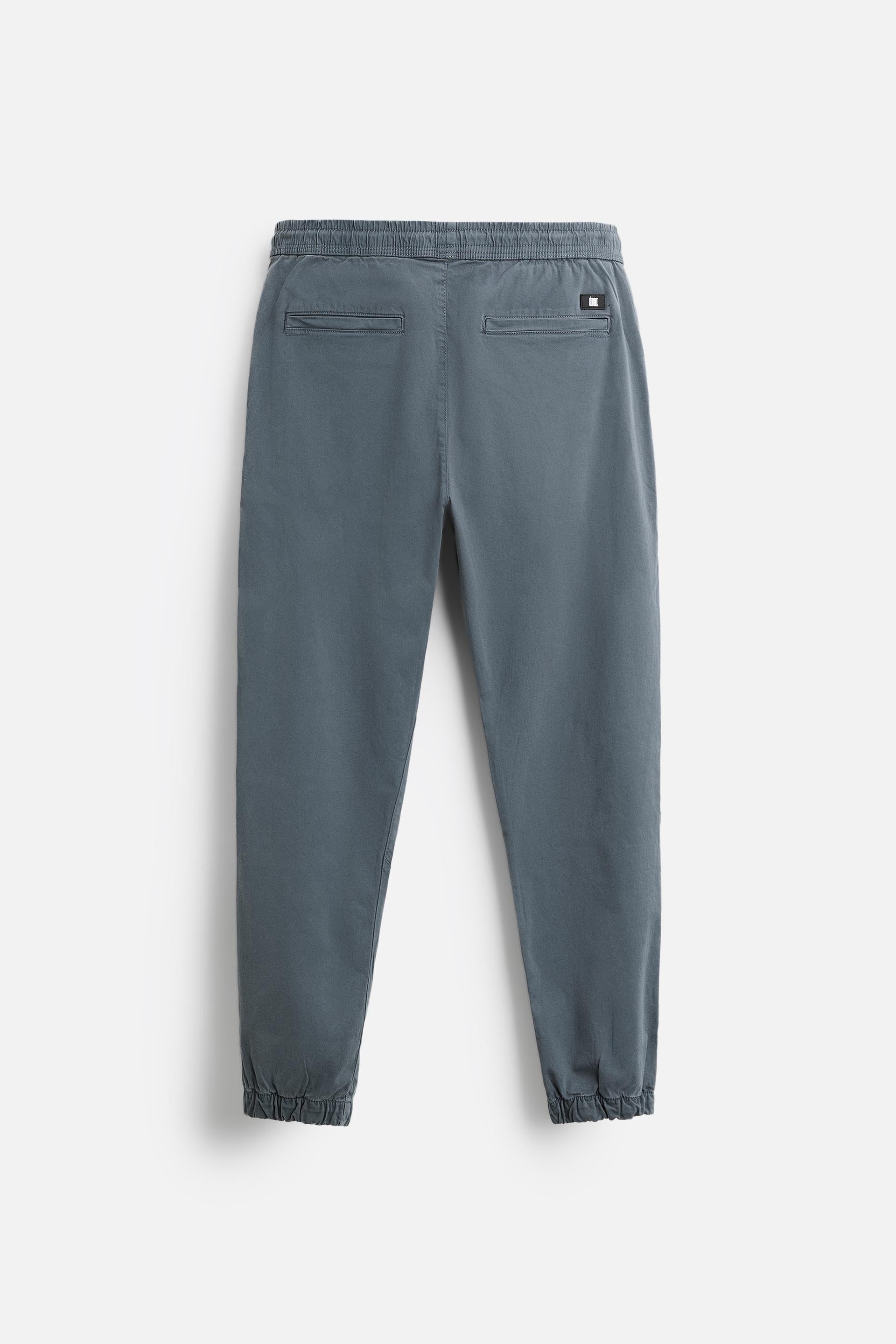 Trousers made of stretch cotton. Elasticated waistband with drawstring. Front pockets and back welt pockets. Cuffed elasticated hems.